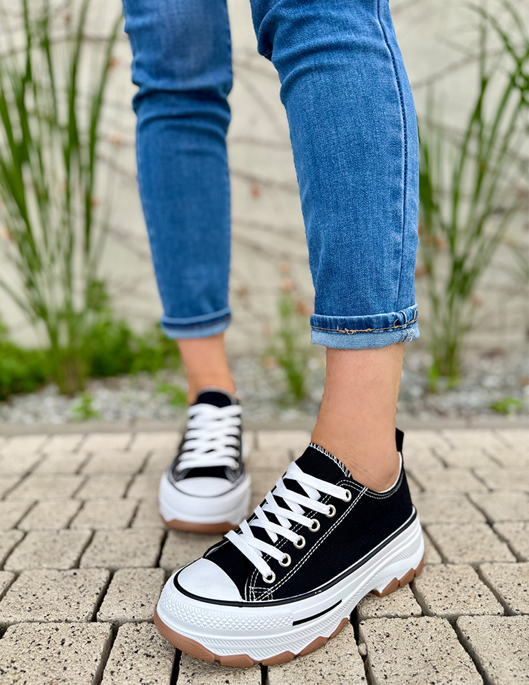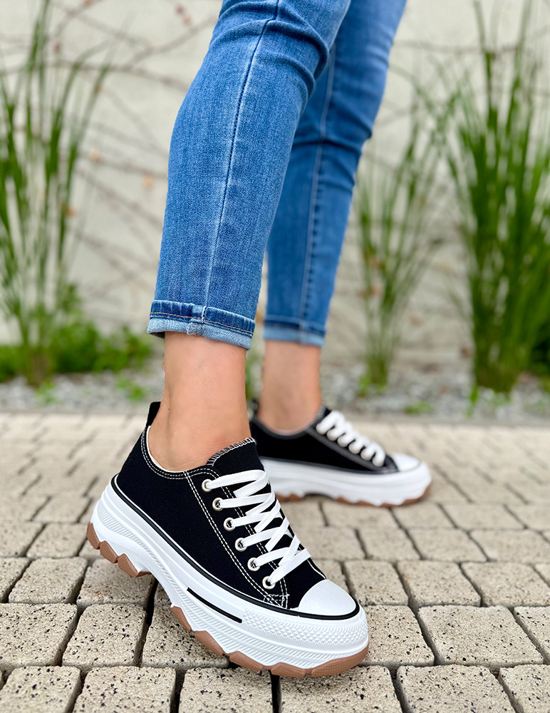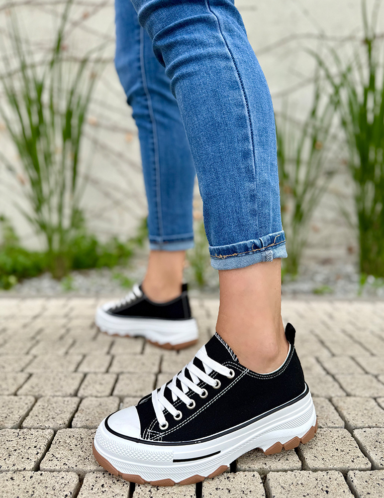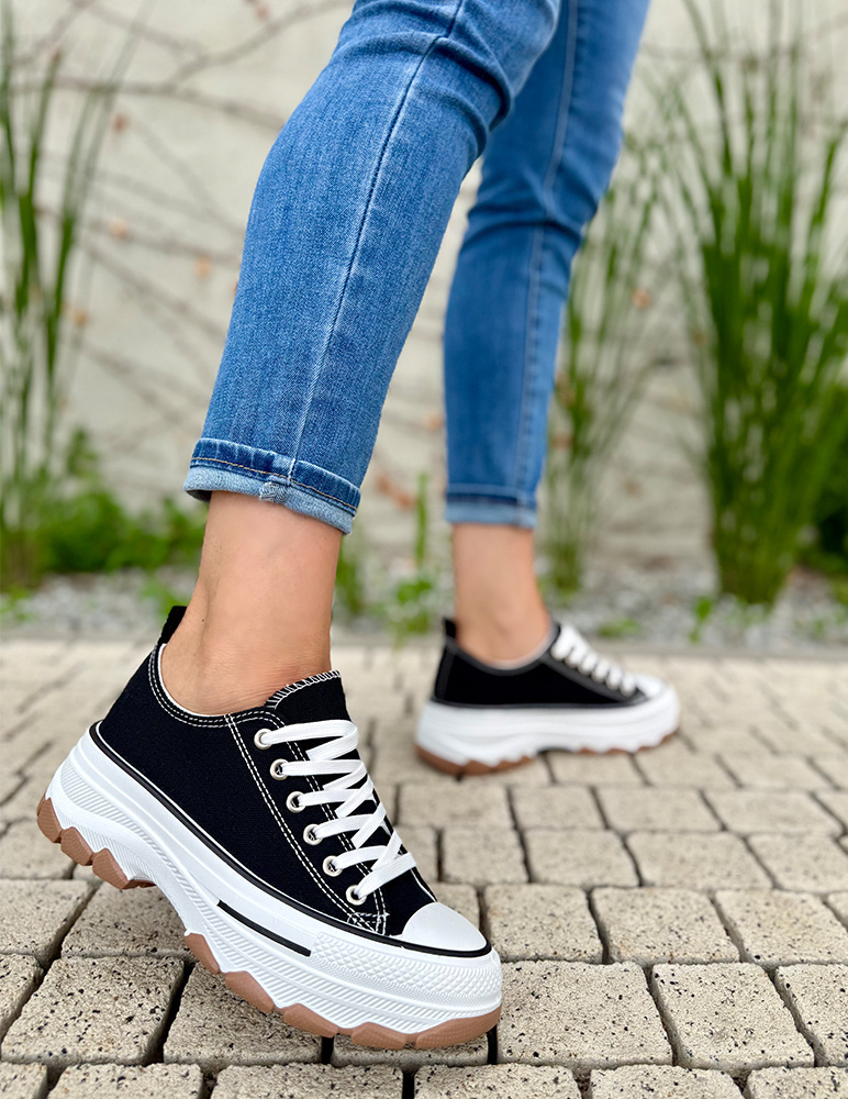 Tieto štýlové čierne plátené tenisky Saria sú ideálnym doplnkom ku každodennému outfitu. Vďaka jednoduchému dizajnu a hrubšej podrážke ponúkajú dokonalú kombináciu pohodlia a moderného vzhľadu. Vyrobené z kvalitného a priedušného plátna, ktoré sa prispôsobí tvaru nohy, a doplnené o pevne šitú podrážku pre lepšiu stabilitu a dlhšiu životnosť. Hrubšia podrážka zabezpečí komfort pri chôdzi a zároveň dodá celkovému dizajnu mestský, trendový look.