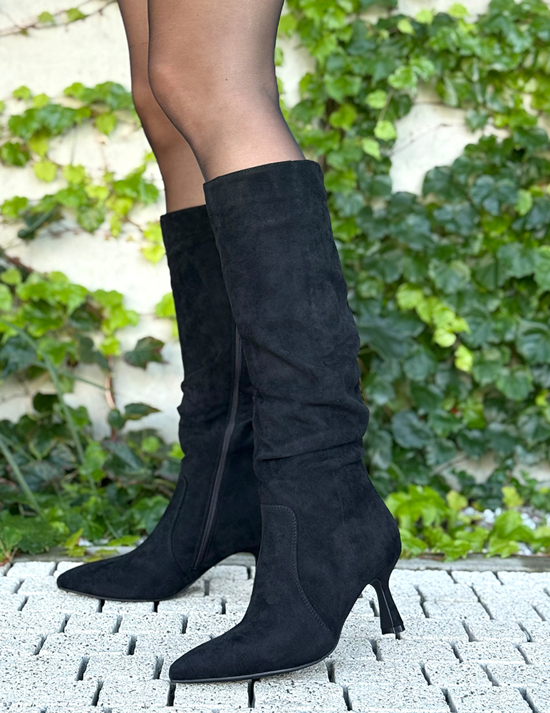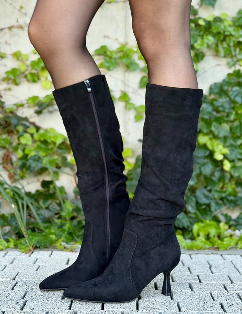 Elegantné dámske čižmy Noemi v klasickej čiernej farbe sú ideálnou voľbou pre modernú ženu, ktorá túži po štýle a pohodlí v jednom. Čižmy majú štíhly, špicatý tvar špičky a nízky, tenký podpätok typu kitten heel, ktorý dodáva ženskosť a zároveň komfort pri chôdzi. Vrchný materiál pripomína jemný semiš, ktorý pôsobí luxusne a je príjemný na dotyk. Vnútro čižmy je textilné.