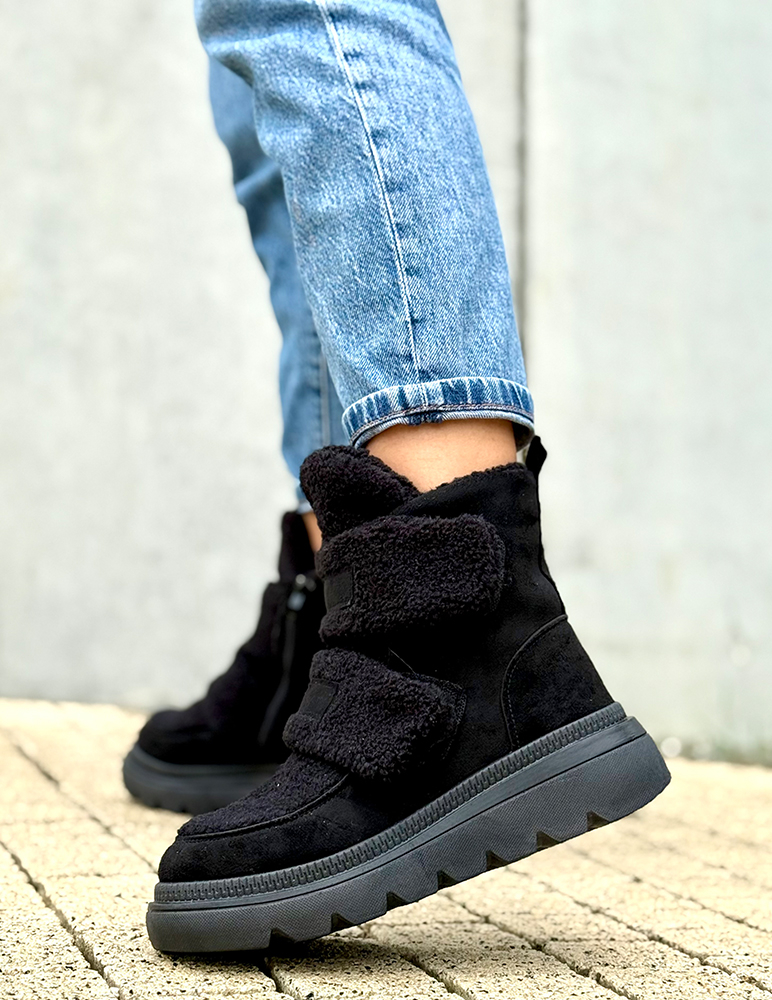 Vykročte do zimy štýlovo a pohodlne! Dámske zimné čierne topánky Shiloh sú ideálnou voľbou pre chladné dni. Kombinujú trendy dizajn, hrejivý kožušinový vzhľad a praktické zapínanie na suchý zips, vďaka čomu sa ľahko obúvajú aj vyzúvajú.