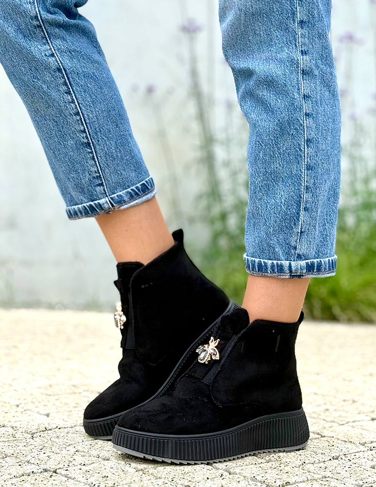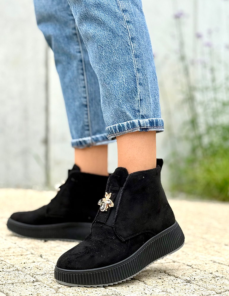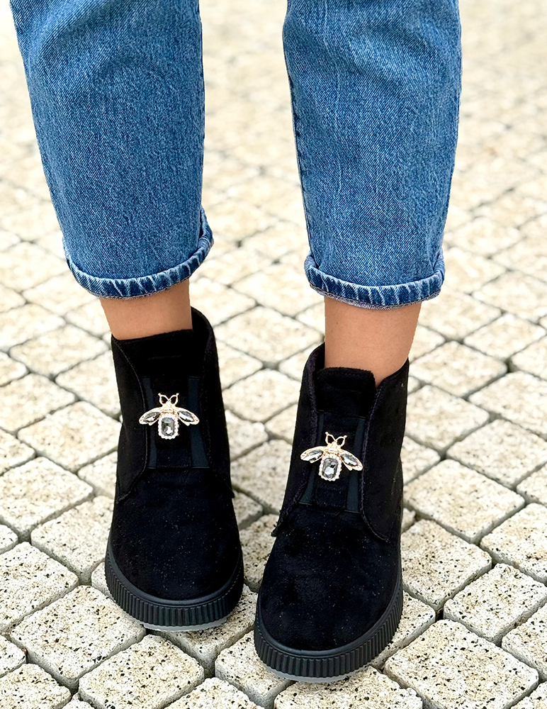Zvýraznite svoj jesenný outfit týmito štýlovými dámskymi čiernymi členkovými topánkami Alesia. Ich nadčasový dizajn v kombinácii s elegantnou ozdobou v tvare včely dodáva každému kroku nádych originality a ženskosti. Vyrobené z kvalitného syntetického semišu, sú ideálne na každodenné nosenie aj na výnimočné príležitosti. Vnútro topánky je z jemného plyšu.