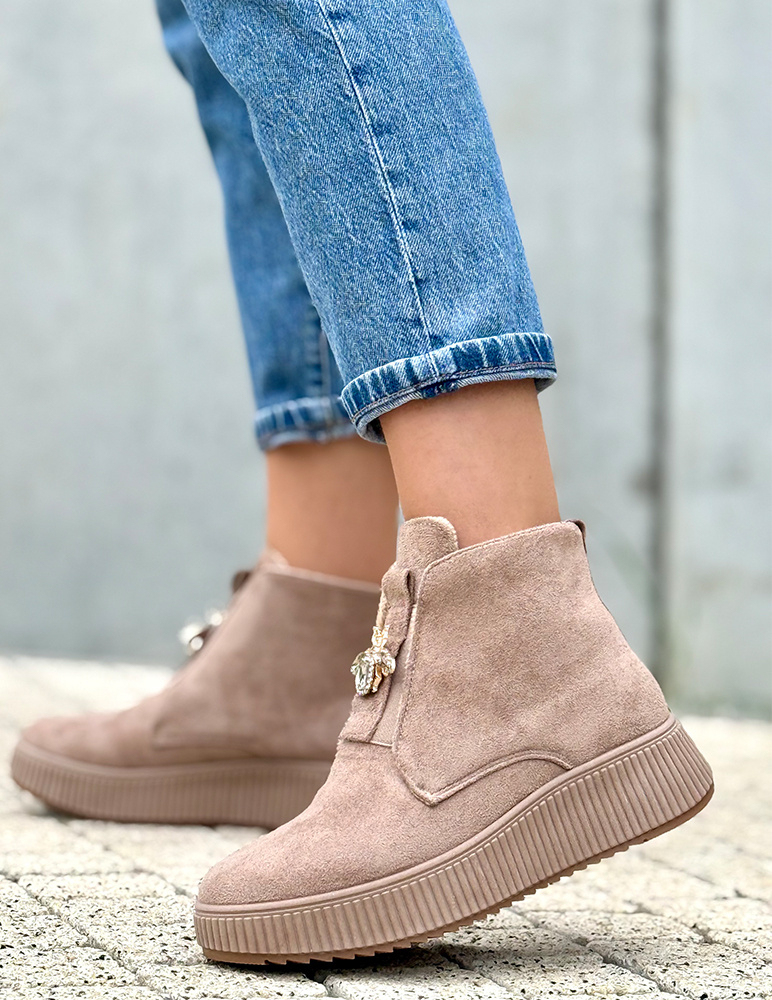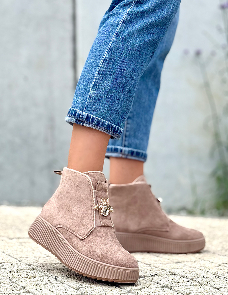 Zvýraznite svoj jesenný outfit týmito štýlovými dámskymi sveltohnedými členkovými topánkami Alesia. Ich nadčasový dizajn v kombinácii s elegantnou ozdobou v tvare včely dodáva každému kroku nádych originality a ženskosti. Vyrobené z kvalitného syntetického semišu, sú ideálne na každodenné nosenie aj na výnimočné príležitosti. Vnútro topánky je z jemného plyšu.