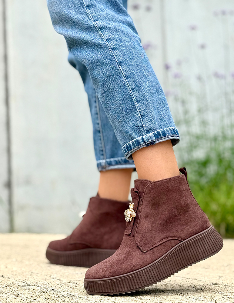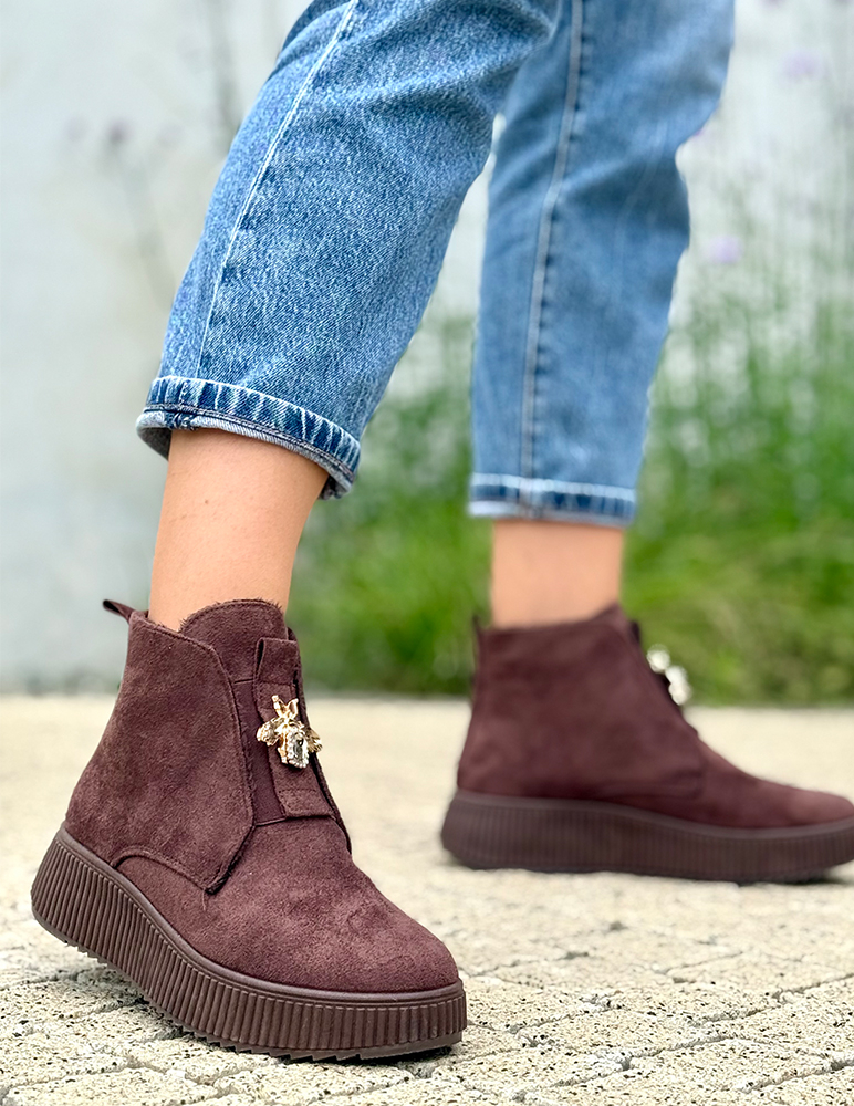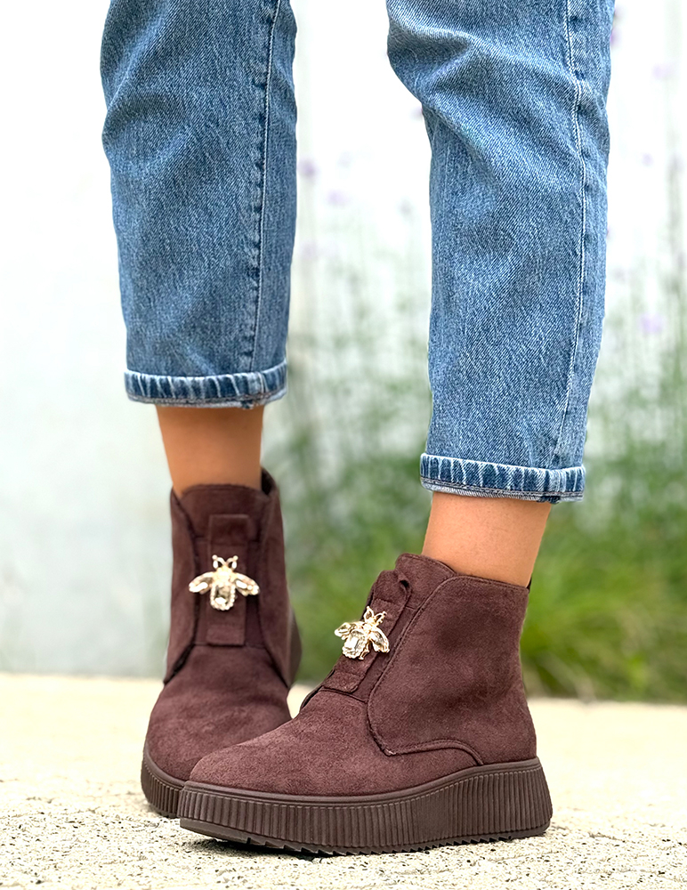 Zvýraznite svoj jesenný outfit týmito štýlovými dámskymi hnedými členkovými topánkami Alesia. Ich nadčasový dizajn v kombinácii s elegantnou ozdobou v tvare včely dodáva každému kroku nádych originality a ženskosti. Vyrobené z kvalitného syntetického semišu, sú ideálne na každodenné nosenie aj na výnimočné príležitosti. Vnútro topánky je z jemného plyšu.