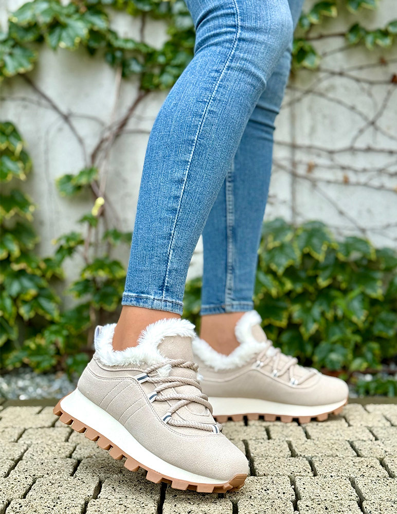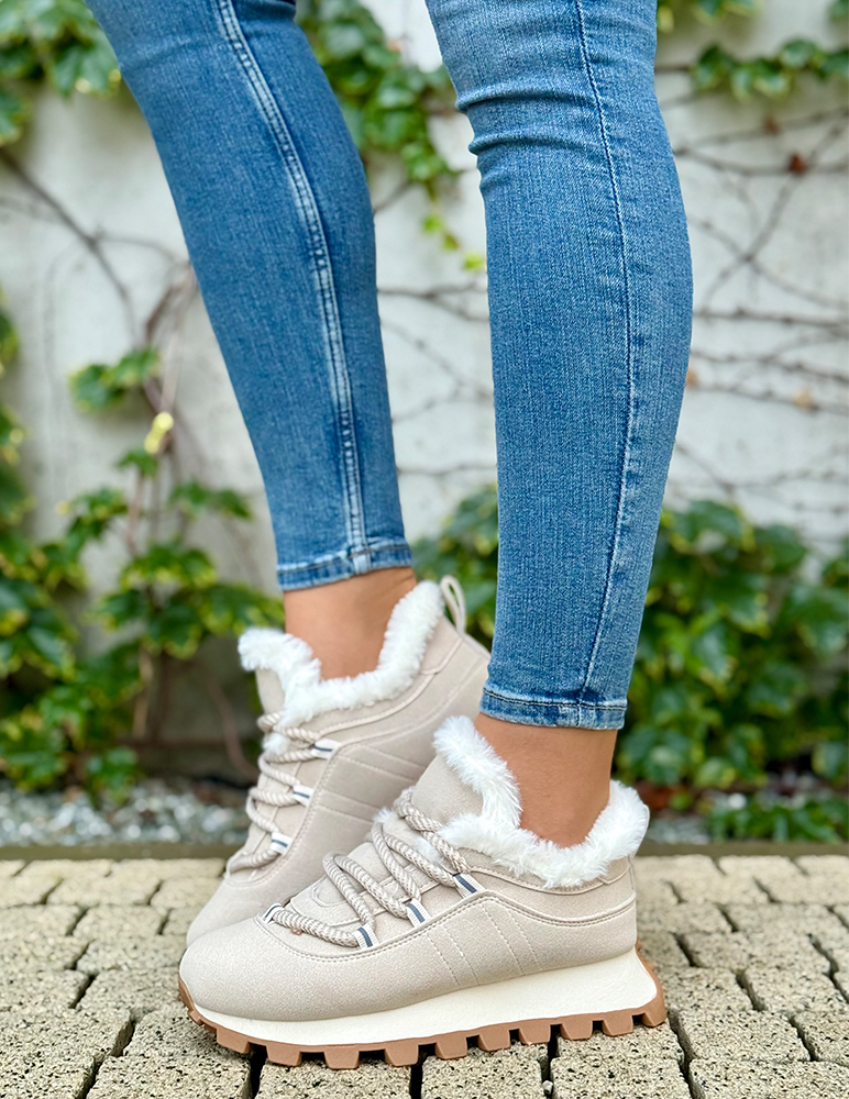Štýlové a pohodlné členkové tenisky ideálne na zimné obdobie. Vrchný materiál má jemný semišový vzhľad a je doplnený o hustý, mäkký umelý kožúšok po obvode členka, ktorý poskytuje teplo a komfort počas chladných dní. Robustná podrážka s výrazným vzorovaním zaisťuje stabilitu a protišmykovosť, ideálna na sneh aj klzký povrch. Topánky majú hrubé, dekoratívne šnúrky a vystužený jazyk, čo zaručuje pevné uchytenie nohy. Vďaka neutrálnemu béžovému odtieňu sú ľahko kombinovateľné s rôznymi outfitmi. Hrubo zateplené plyšom.