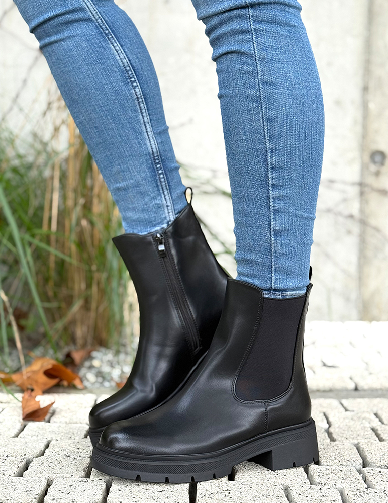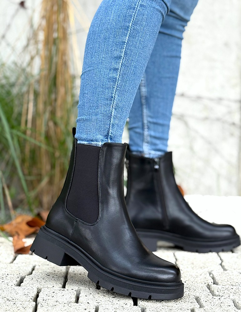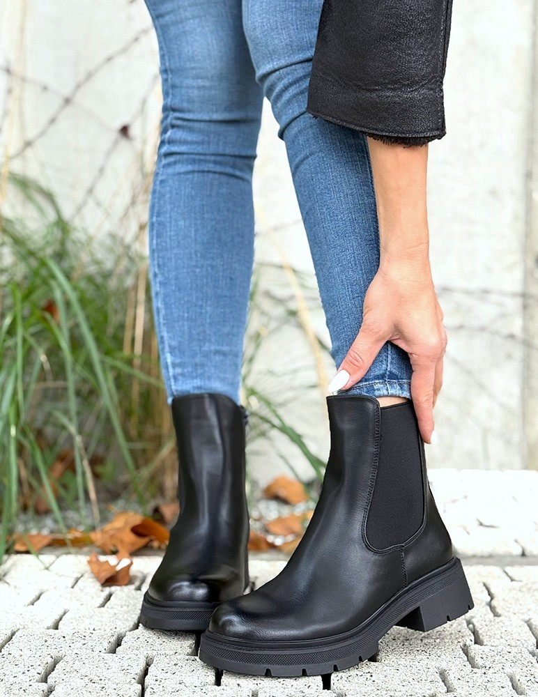 Čierne čižmy Iris sú praktickou kombináciou štýlu a pohodlia. Vyrobené sú z kvalitného materiálu hladkej ekokože. Ich dizajn dopĺňa hrubšia gumička, čo umožňuje pohodlné obúvanie. Výrazná podrážka predlžuje postavu a zabezpečuje komfort pri chôdzi. Tieto štýlové čižmy sú ideálne na bežné nosenie počas jesene a zimy. Skvele sa hodia k džínsom, kabátu alebo koženej bunde. Topánky sú zateplené jemným plyšom.