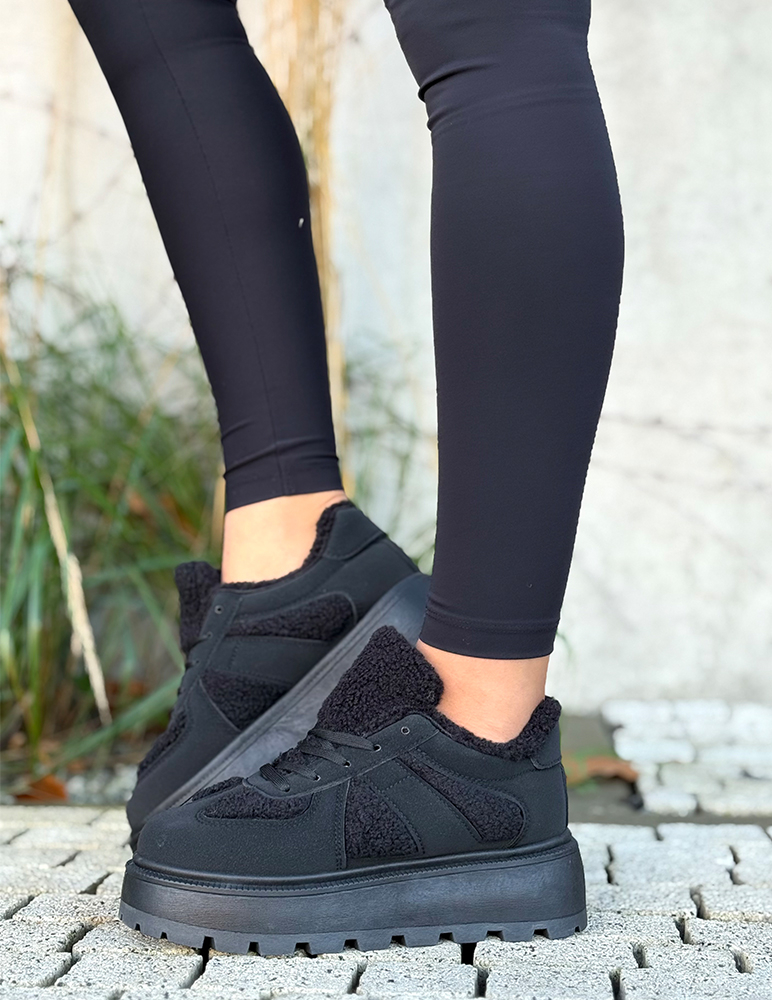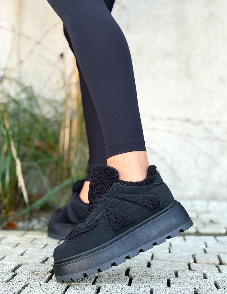 Tieto topánky sú dámske zimné tenisky v čiernej farbe v kombinácii s moderným športovým dizajnom. Majú zvršok z kombinácie materiálov – hladký povrch, semišové časti a hebkú tkaninu pripo-mínajúcu ovčiu vlnu. Disponujú klasickým šnurovaním pre lepšie prispôsobenie nohe a stabilitu. Tieto tenisky sú ideálne na prechody medzi jeseňou a zimou, ponúkajú pohodlie, hrejivosť a moderný mestský štýl. Skvele sa hodia k džínsom, legínam aj športovým outfitom. Tenisky sú hrubo vyteplené.