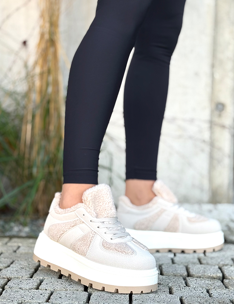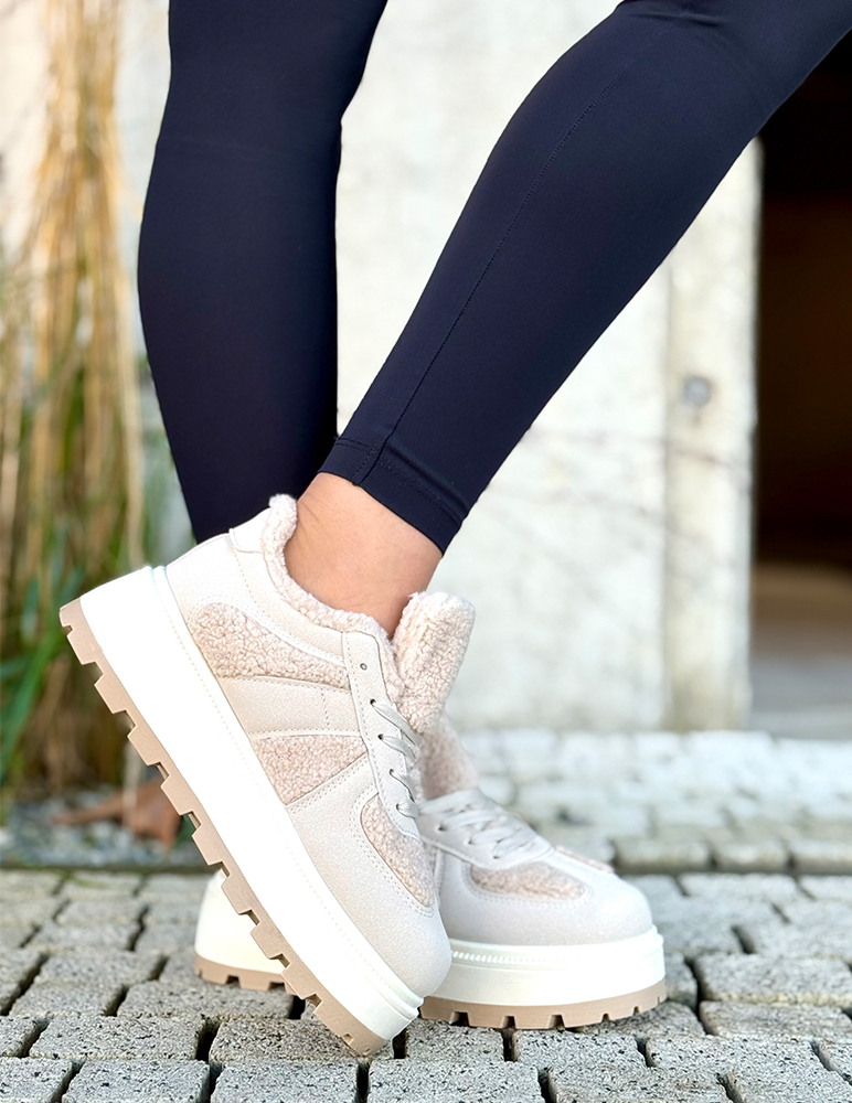 Tieto topánky sú dámske zimné tenisky v bežovej farbe v kombinácii s moderným športovým dizajnom. Majú zvršok z kombinácie materiálov – hladký povrch, semišové časti a hebkú tkaninu pripo-mínajúcu ovčiu vlnu. Disponujú klasickým šnurovaním pre lepšie prispôsobenie nohe a stabilitu. Tieto tenisky sú ideálne na prechody medzi jeseňou a zimou, ponúkajú pohodlie, hrejivosť a moderný mestský štýl. Skvele sa hodia k džínsom, legínam aj športovým outfitom. Tenisky sú hrubo vyteplené.