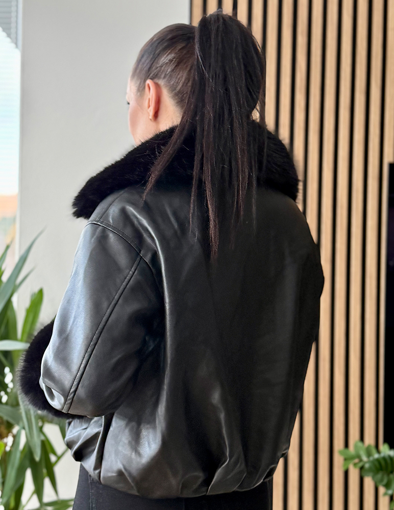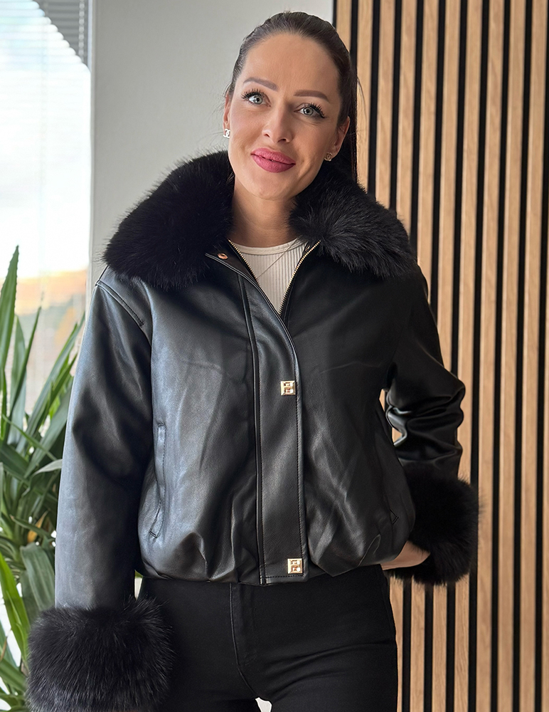 Čierna bunda z ekokože s kožušinou na golieri a rukávoch je nádherný model, ktorý je ozdobený cvokmi, ale zapína sa na vnútorný zips. Kožušina na golieri a rukávoch je výrazná a bunde dodáva luxusný vzhľad. Kožušinka je odopínateľná aj na golieri, aj na rukávaoch. Bunda má aj funkčné vrecká. Tento typ bundy zvýrazní aj jednoduchý a outfit a dodá mu štýl a noblesu. Bunda je vo vnútri zateplená plyšom.