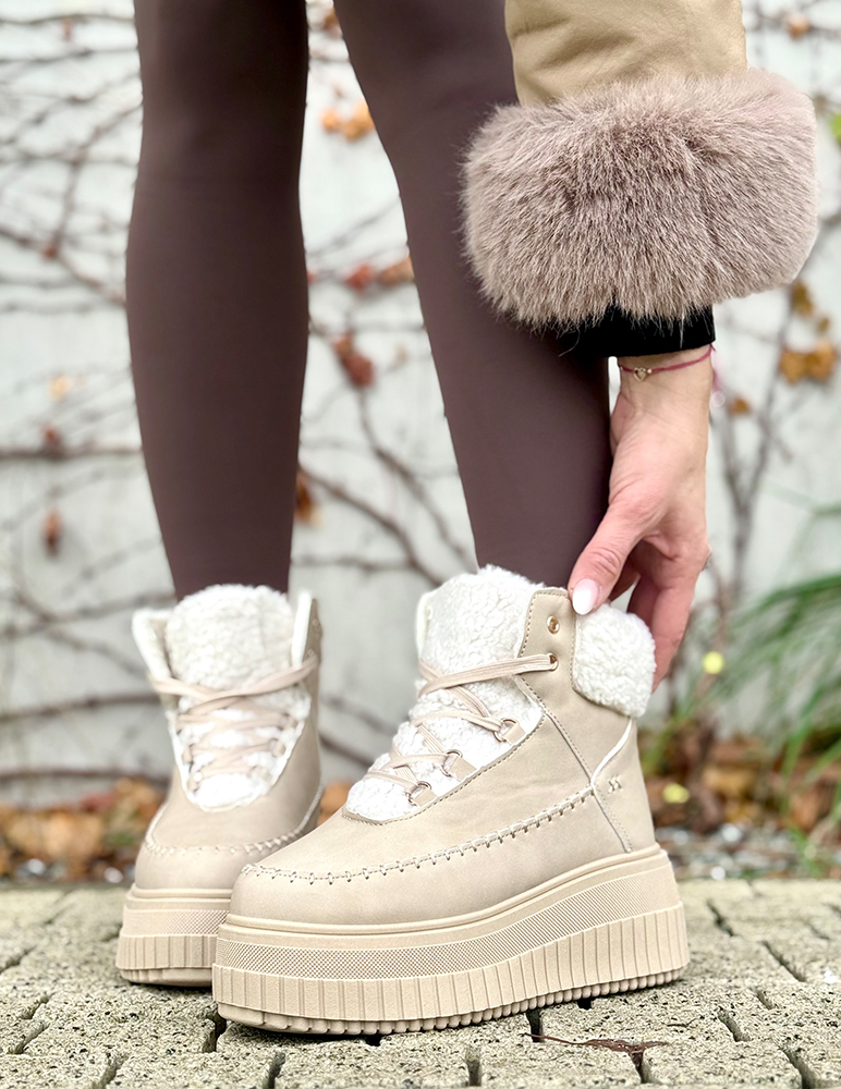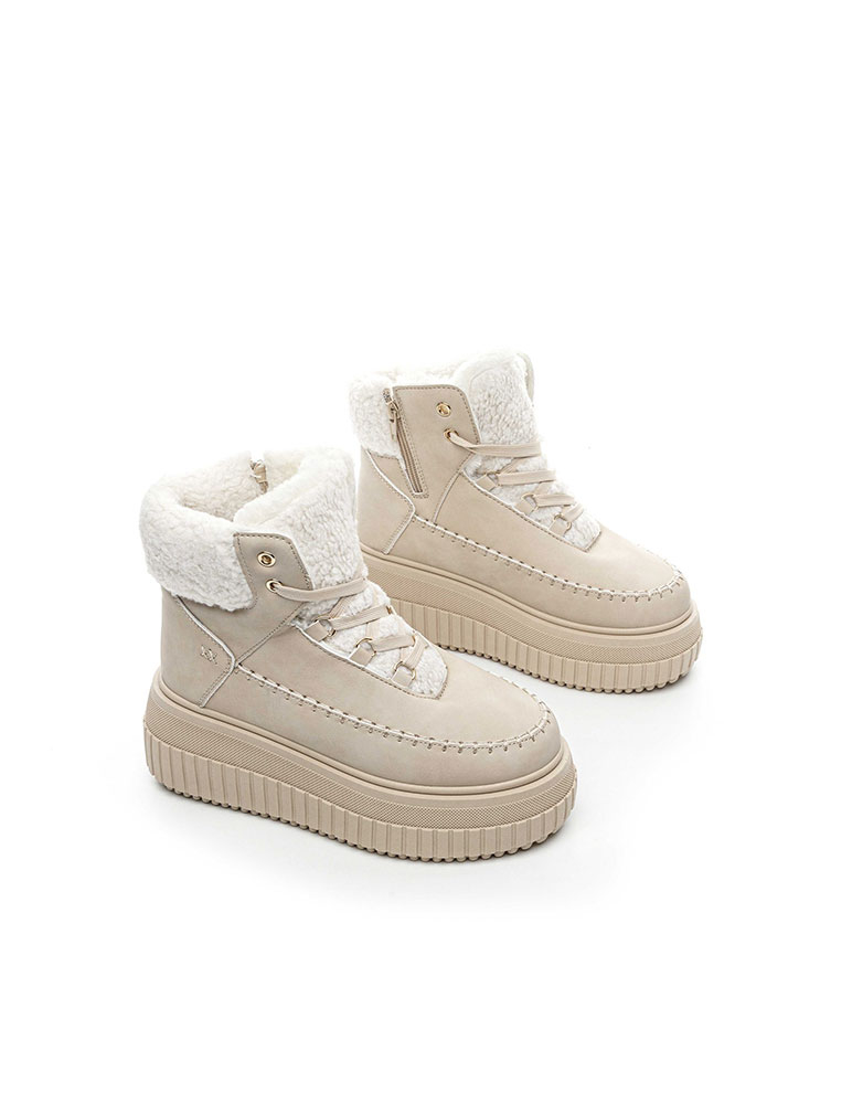 Tieto topánky sú štýlové zimné topánky s teplým vnútrom a moderným dizajnom. Majú mäkkú, huňatú podšívku v oblasti členkov a jazyka, ktorá zaručuje teplo a pohodlie počas chladných dní. Hladký povrch doplnený decentným prešívaním, vytvára jemné zvýraznenie topánok. Šnurovanie vpredu a bočný zips, ktorý uľahčuje obúvanie. Hrubá, profilovaná podrážka poskytuje stabilitu a výbornú izoláciu od chladu. Moderný mestský vzhľad topánok sa hodí k zimným aj jesenným outfitom. Celkovo ide o praktické, teplé a veľmi štýlové zimné topánky, vhodné na každodenné nosenie. Topánky sú hrubo vyteplené.
