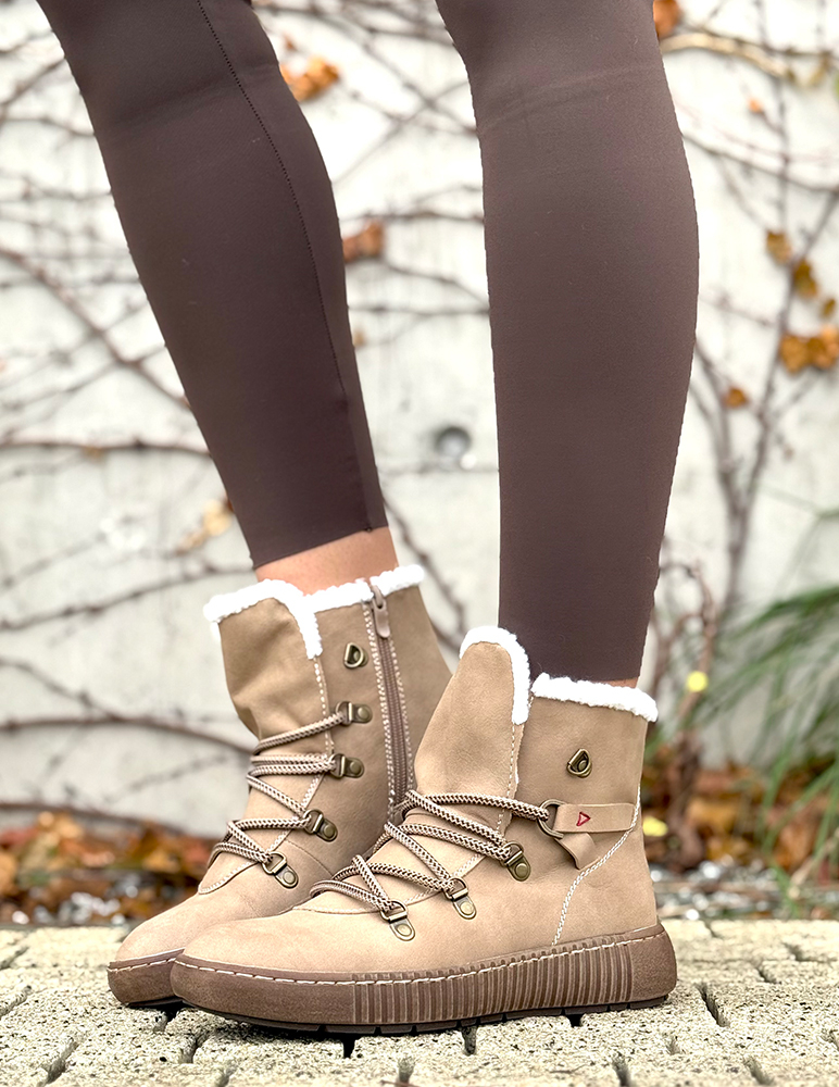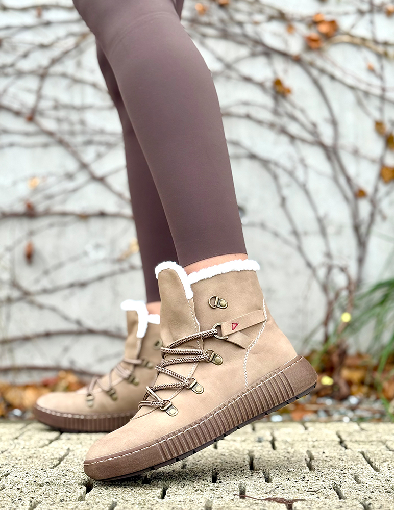 Tieto topánky sú štýlové zimné členkové topánky v béžovej farbe, navrhnuté tak, aby poskytovali komfort, teplo aj stabilitu v chladnom počasí. Povrch topánok je z ekokože s jemnou textúrou, odolný voči poveternostným podmienkam. Vnútro majú zateplené mäkkou bielou kožušinou, ktorá siaha až po horný okraj a zabezpečuje príjemné teplo. Zapínanie majú na šnurovanie so spevnenými kovovými očkami a dvojfarebnými šnúrkami pre pevné uchytenie nohy. Podrážka je mierne vyvýšená so vzorovaním pre lepšiu trakciu na klzkom povrchu. Moderný outdoorový vzhľad topánok je doplnený o dekoratívne prešívanie a malé bočné detaily. Sú ideálne na každodenné nosenie počas zimy aj do mierne náročného terénu.