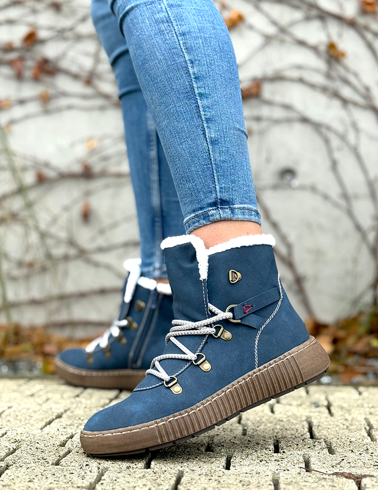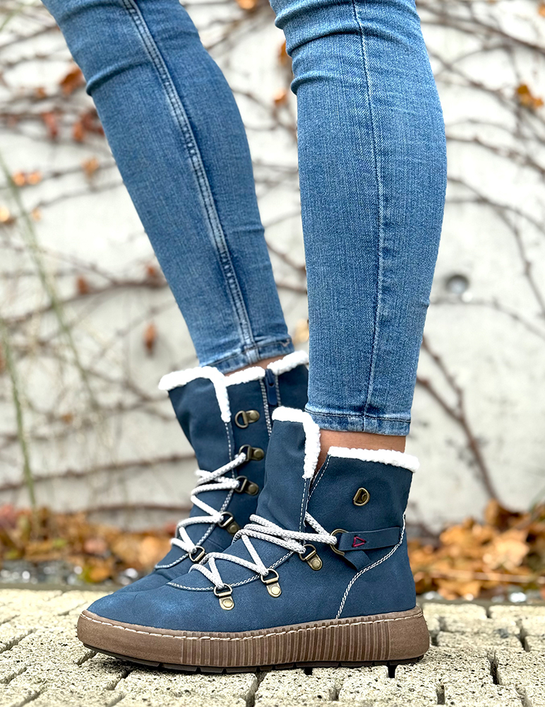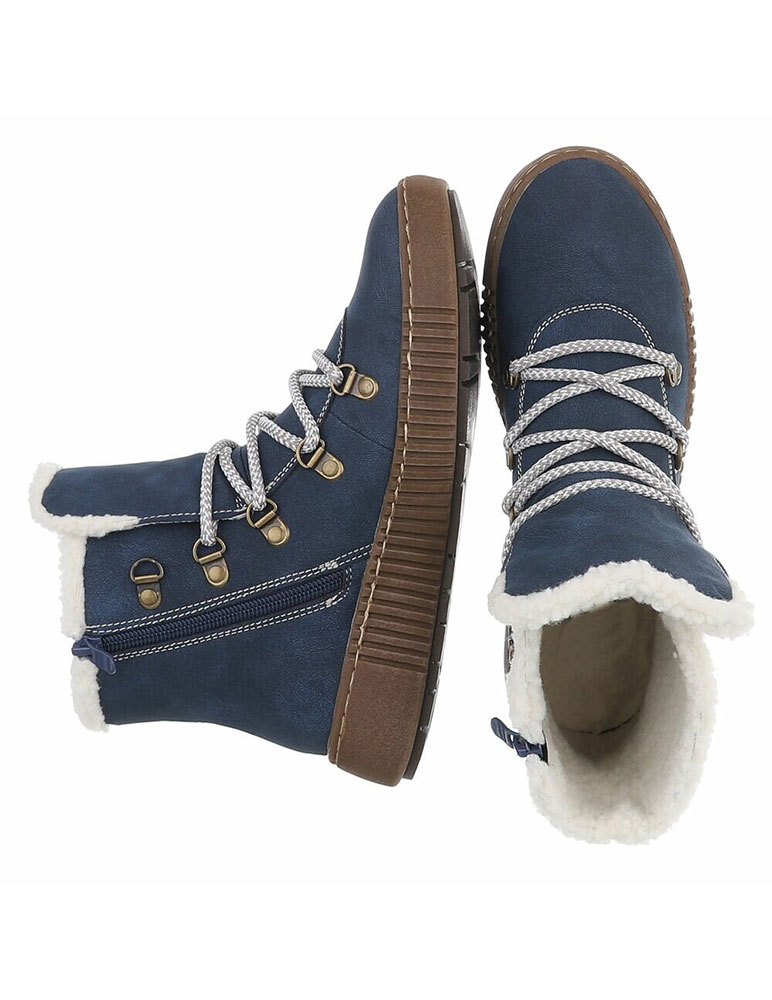 Tieto topánky sú štýlové zimné členkové topánky v modrej farbe, navrhnuté tak, aby poskytovali komfort, teplo aj stabilitu v chladnom počasí. Povrch topánok je z ekokože s jemnou textúrou, odolný voči poveternostným podmienkam. Vnútro majú zateplené mäkkou bielou kožušinou, ktorá siaha až po horný okraj a zabezpečuje príjemné teplo. Zapínanie majú na šnurovanie so spevnenými kovovými očkami a dvojfarebnými šnúrkami pre pevné uchytenie nohy. Podrážka je mierne vyvýšená so vzorovaním pre lepšiu trakciu na klzkom povrchu. Moderný outdoorový vzhľad topánok je doplnený o dekoratívne prešívanie a malé bočné detaily. Sú ideálne na každodenné nosenie počas zimy aj do mierne náročného terénu. Zateplené kožušinkou.