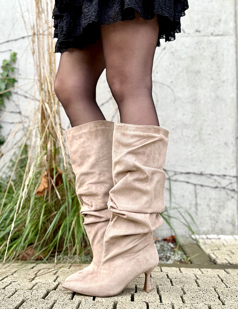 Khaki dámske čižmy so štýlovým „slouchy“ (zhŕňaným) dizajnom. Sú vyrobené z materiálu ekosemiš a majú špicatú špičku, ktorá pôsobí elegantne. Nižší tenký opätok čižiem (kitten heel) je vhodný na pohodlnejšie nosenie. Stredne vysoký zvršok, ktorý sa voľne zhŕňa okolo lýtka pôsobí elegantne. Sú to módne, jemne elegantné čižmy ideálne na jeseň a zimu, ktoré sa hodia k sukniam, šatám aj úzkym džínsom.