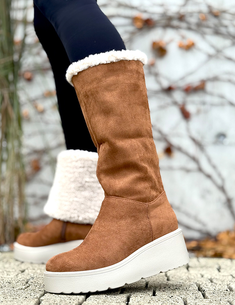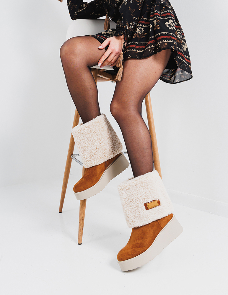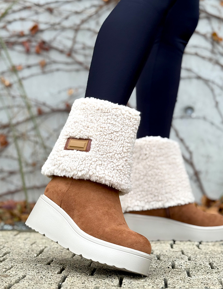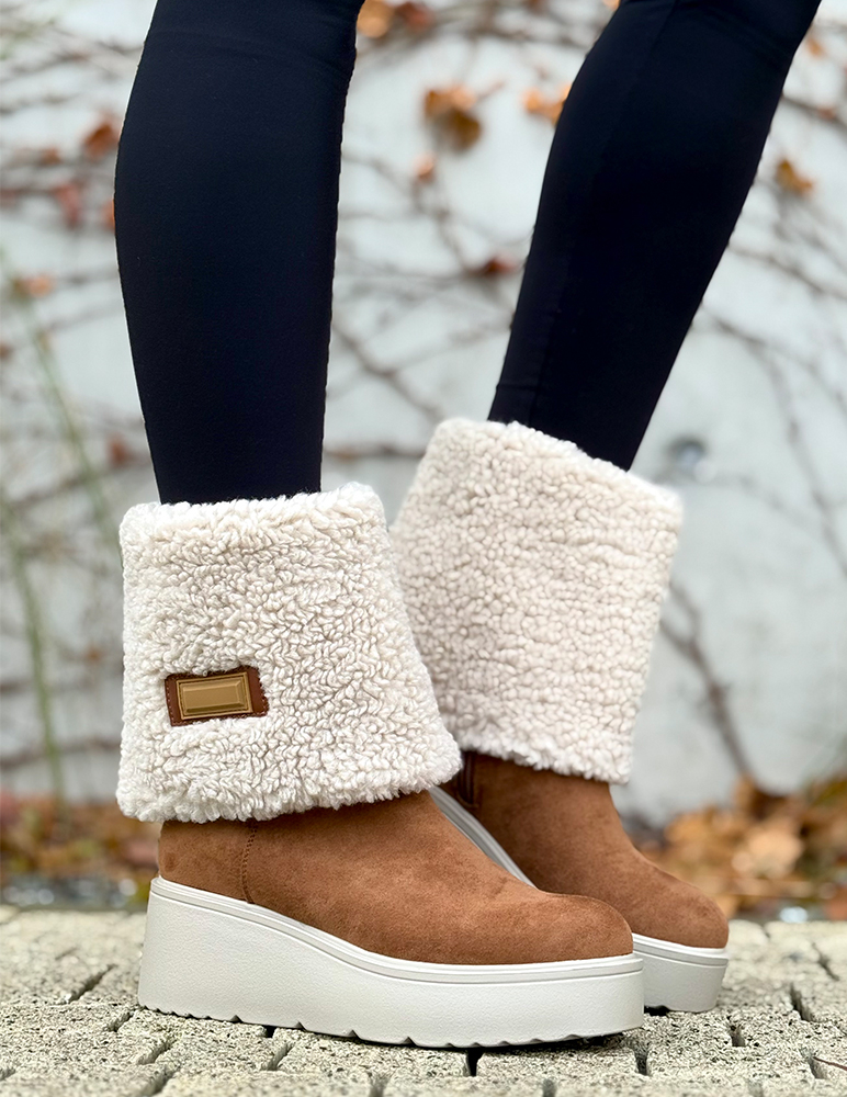 Toto sú camel dámske zimné čižmy s výrazným kožušinovým golierom a platformovou podrážkou. Spodná časť je z materiálu ekosemiš v camel farbe a vrchná časť je pokrytá mäkkou, huňatou kožušinou v krémovom odtieni – pôsobí veľmi teplo a zimne. Vysoká platforma poskytuje dobrú izoláciu od chladu a pridáva výšku bez potreby vysokého opätku. Veľmi teplé, mäkučké a štýlové zimné čižmy ideálne do chladného počasia.