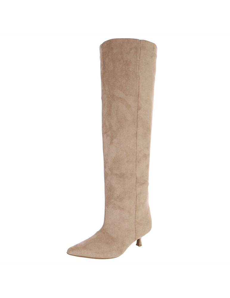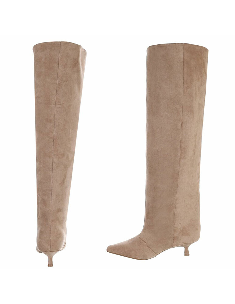 Dámske vysoké čižmy nad kolená v elegantnom prevedení. Vyrobené sú zo semišového materiálu, ktorý pôsobí štýlovo a nadčasovo. Čižmy majú špicatú špičku a tenký nízky podpätok, ktorý dodáva jemný ženský vzhľad a zároveň je pohodlnejší na nosenie. Ideálne na kombinovanie so šatami, sukňami aj úzkymi nohavicami – vhodné na bežné nosenie aj elegantnejšie príležitosti počas jesene a zimy. Vnútro čižmy je textilné.