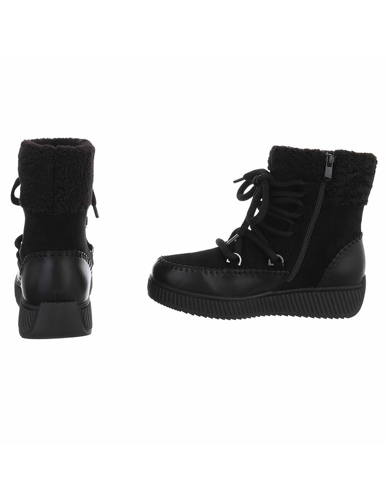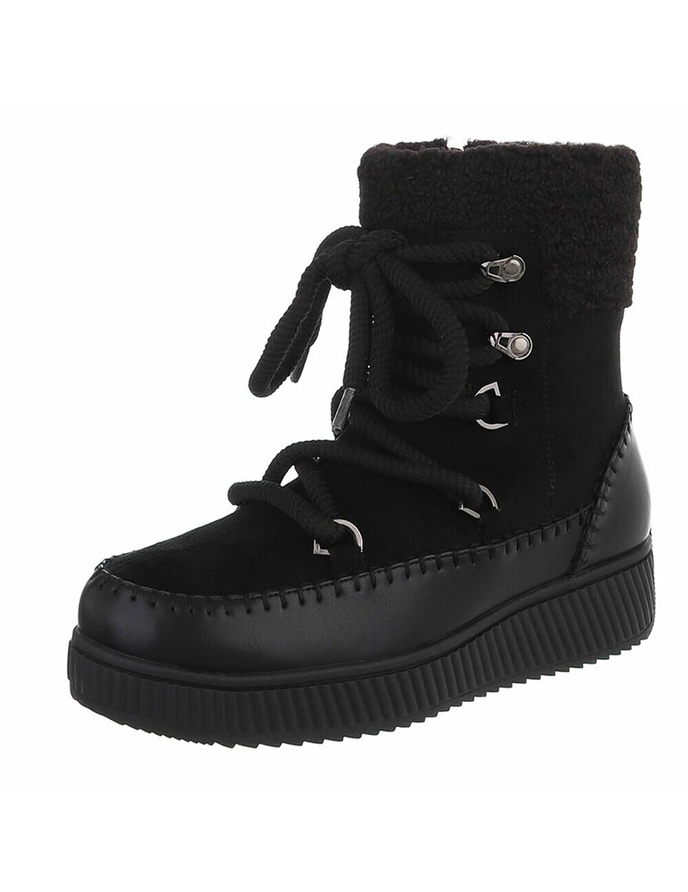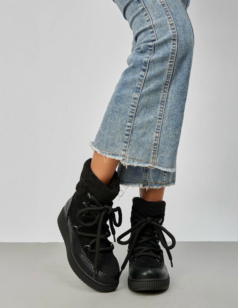 Čierne dámske snehule majú moderný, športovo-elegantný vzhľad. Zvršok je vyrobený z mäkkého materiálu ekosemiš a v hornej časti je doplnený o hrejivú kožušinovú manžetu. Väčšiešnúrky prechádzajú cez kovové očká a háčiky, čo dodáva topánkam výrazný štýl aj dobré prispôsobenie na nohe. Spodná časť je z hladkej ekokože so šitým lemovaním, ktoré pôsobí masívne a odolne. Podrážka je hrubšia, protišmyková a vhodná do zimných podmienok. Celkovo ide o pohodlné zimné snehule, ktoré poskytujú teplo, stabilitu a univerzálny vzhľad vhodný na každodenné nosenie.