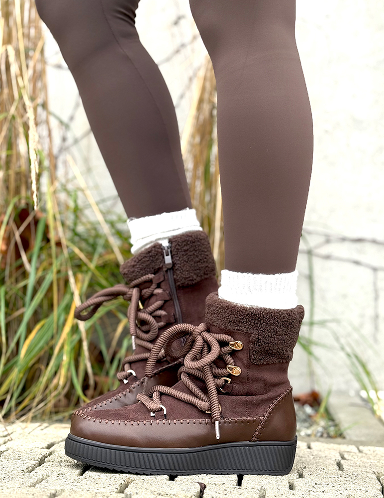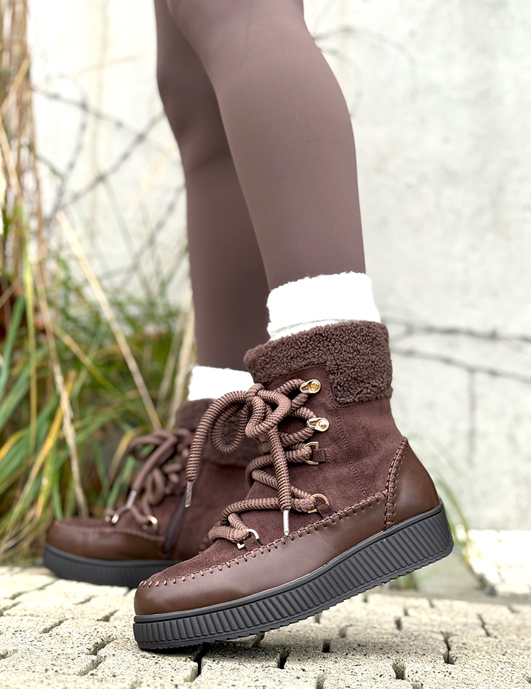 Hnedé dámske snehule majú moderný, športovo-elegantný vzhľad. Zvršok je vyrobený z mäkkého materiálu ekosemiš a v hornej časti je doplnený o hrejivú kožušinovú manžetu. Väčšiešnúrky prechádzajú cez kovové očká a háčiky, čo dodáva topánkam výrazný štýl aj dobré prispôsobenie na nohe. Spodná časť je z hladkej ekokože so šitým lemovaním, ktoré pôsobí masívne a odolne. Podrážka je hrubšia, protišmyková a vhodná do zimných podmienok. Celkovo ide o pohodlné zimné snehule, ktoré poskytujú teplo, stabilitu a univerzálny vzhľad vhodný na každodenné nosenie.