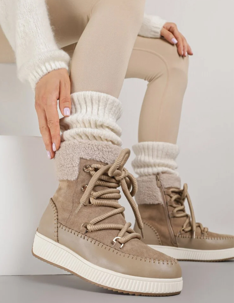 Khaki dámske snehule majú moderný, športovo-elegantný vzhľad. Zvršok je vyrobený z mäkkého materiálu ekosemiš a v hornej časti je doplnený o hrejivú kožušinovú manžetu. Väčšie šnúrky prechádzajú cez kovové očká a háčiky, čo dodáva topánkam výrazný štýl aj dobré prispôsobenie na nohe. Spodná časť je z hladkej ekokože so šitým lemovaním, ktoré pôsobí masívne a odolne. Podrážka je hrubšia, protišmyková a vhodná do zimných podmienok. Celkovo ide o pohodlné zimné snehule, ktoré poskytujú teplo, stabilitu a univerzálny vzhľad vhodný na každodenné nosenie.