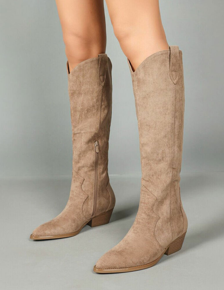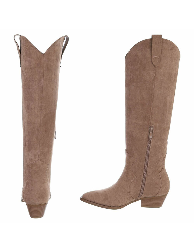 Khaki dámske čižmy majú výrazný westernový štýl. Sú vyrobené z materiálu ekosemiš, ktorý im dodáva mäkký a elegantný vzhľad. Špička je úzka a mierne špicatá, čo zvýrazňuje ich kovbojský charakter. Zvršok siaha až po kolená a má typické oblúkové vykrojenie v hornej časti. Na vnútornej strane sa nachádza praktický zips, ktorý uľahčuje obúvanie. Podpätok je nízky, stabilný a jemne šikmený – typický pre westernové čižmy. Celkovo ide o štýlové, univerzálne čižmy vhodné k šatám, sukniam aj skinny nohaviciam, ideálne na jesenné či zimné obdobie.