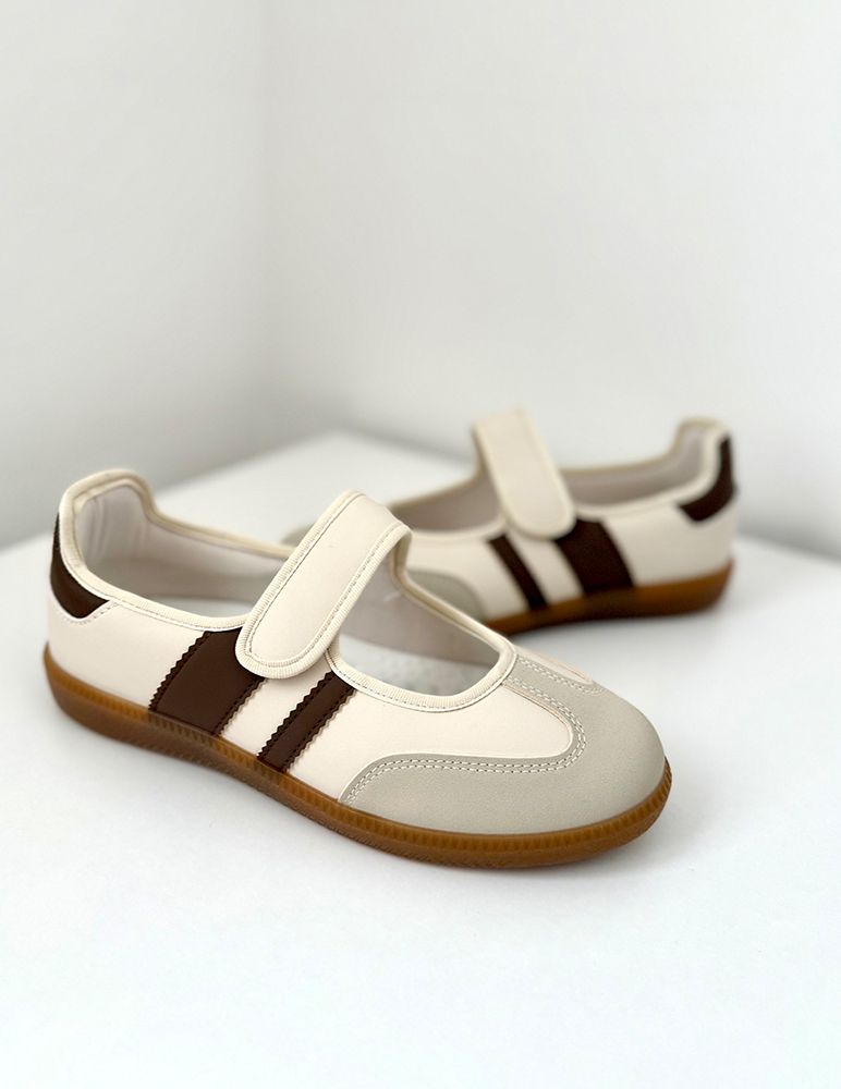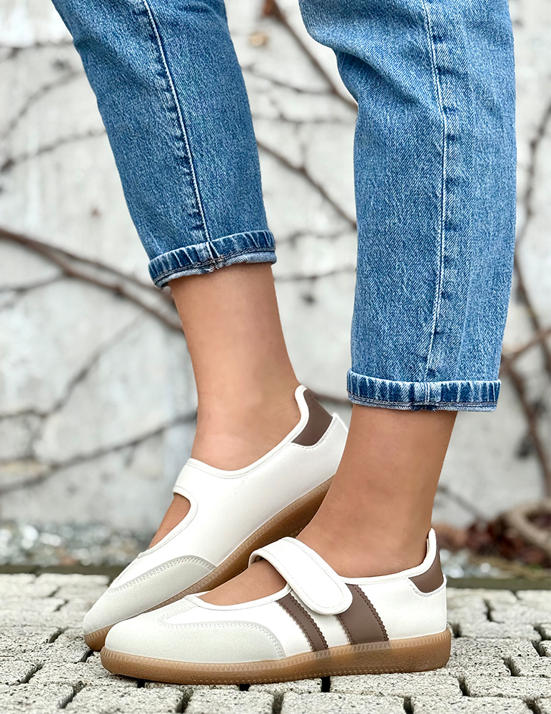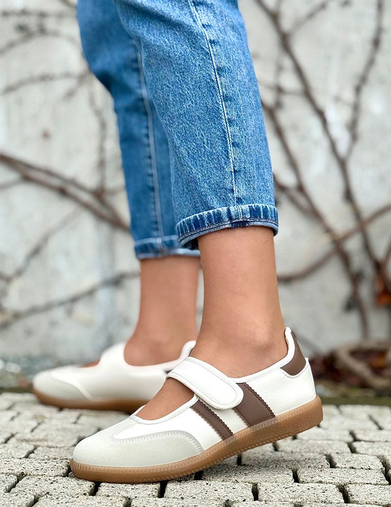 Dámske béžové poltopánky Alaina sú v športovo-elegantnom štýle s hnedými pásikmi. Sú vyhotovené v kombinácii dvoch farieb, ktoré zvýrazňujú štýl poltopánok. Majú zaoblenú špičku a nízku, pohodlnú podrážku v prírodnom hnedom odtieni, ktorá zabezpečuje stabilitu pri chôdzi. Zapínanie je riešené praktickým suchým zipsom, vďaka čomu sa ľahko obúvajú a dobre prispôsobia nohe. Topánky sú vhodné na bežné nosenie, voľný čas alebo dlhšie prechádzky, kde je dôležité pohodlie aj moderný vzhľad.