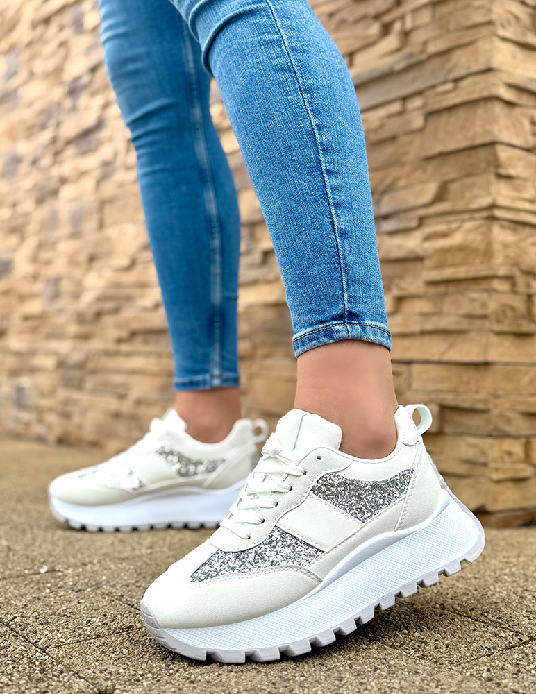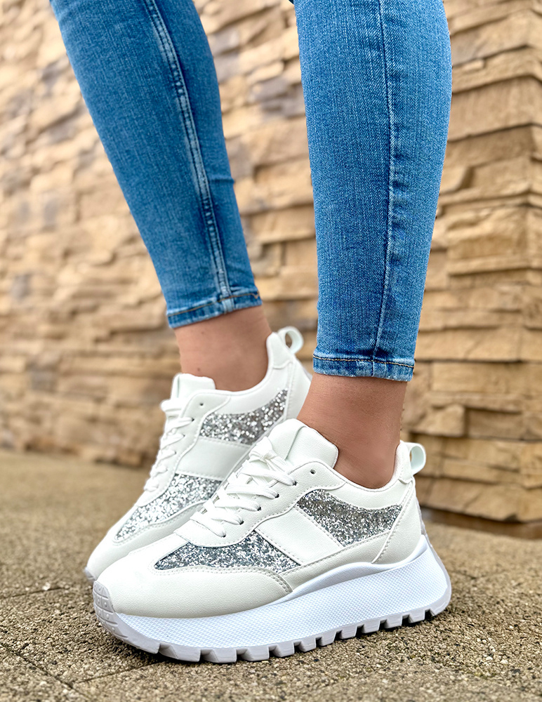 Vystúpte z davu s bielymi teniskami Destiny, ktoré spájajú pohodlie športovej obuvi s pôvabom elegantných detailov! Tieto štýlové tenisky v retro oldschoolovom dizajne sú doplnené o jemné trblietky, ktoré im dodávajú šmrnc a ženský lesk. Perfektné na každodenné nosenie, prechádzky po meste či neformálne stretnutia – všade tam, kde chcete zažiariť.