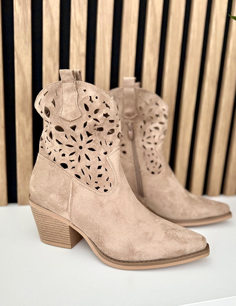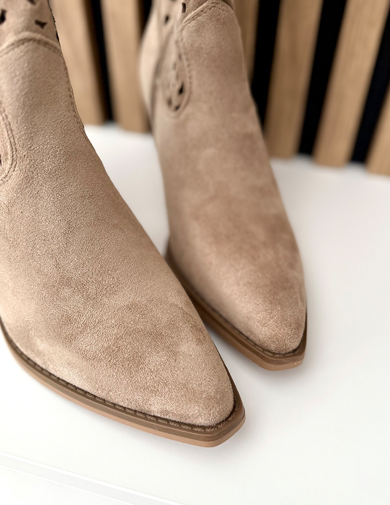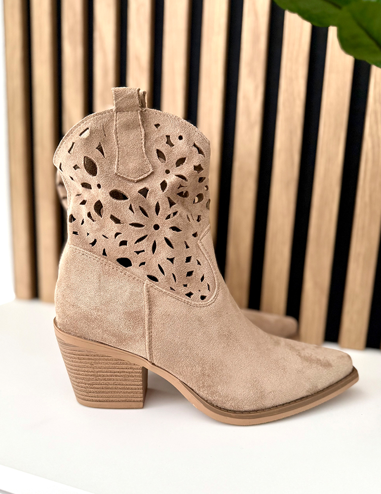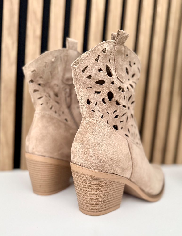 Dámske členkové čižmy v kovbojskom (westernovom) štýle v khaki odtieni. Majú stredne vysoký stabilný podpätok a špicatú špičku, ktorá im dodáva elegantný vzhľad. Zvršok je zdobený dekoratívnym perforovaným vzorom, vďaka ktorému pôsobia ľahko a vzdušne, ideálne na prechodné obdobie. Čižmy majú bočný zips pre jednoduché obúvanie a pútka v hornej časti pre pohodlné obúvanie. Sú vhodné na bežné nosenie aj štýlové mestské outfity, najmä na jar alebo jeseň.