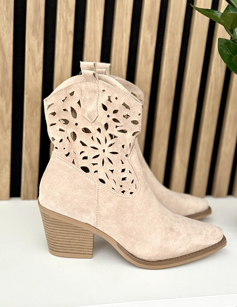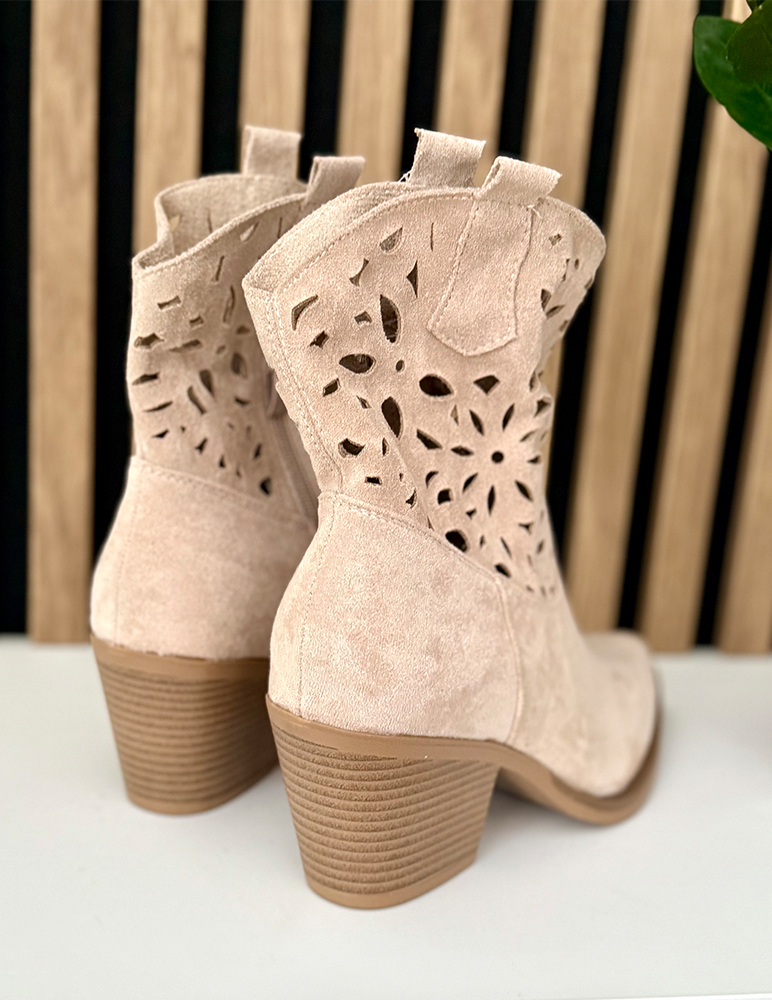 Dámske členkové čižmy v kovbojskom (westernovom) štýle v béžovom odtieni. Majú stredne vysoký stabilný podpätok a špicatú špičku, ktorá im dodáva elegantný vzhľad. Zvršok je zdobený dekoratívnym perforovaným vzorom, vďaka ktorému pôsobia ľahko a vzdušne, ideálne na prechodné obdobie. Čižmy majú bočný zips pre jednoduché obúvanie a pútka v hornej časti pre pohodlné obúvanie. Sú vhodné na bežné nosenie aj štýlové mestské outfity, najmä na jar alebo jeseň.