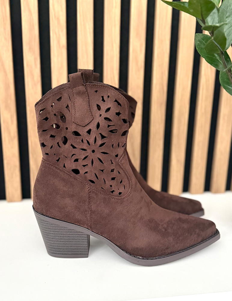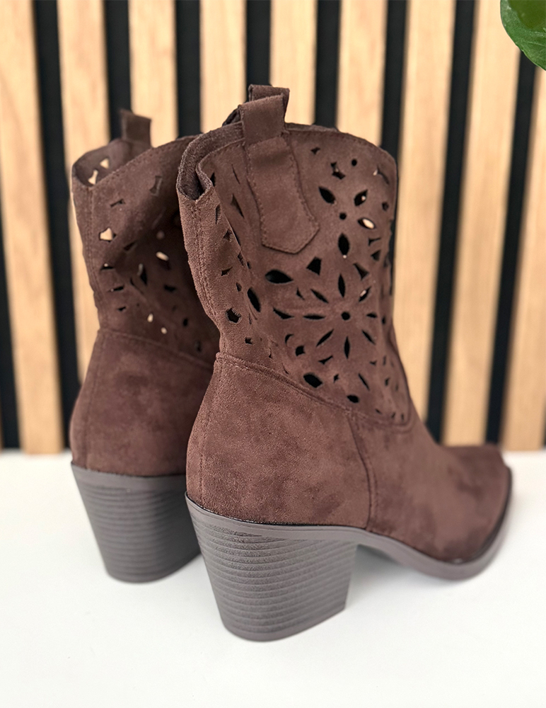 Dámske členkové čižmy v kovbojskom (westernovom) štýle v hnedom odtieni. Majú stredne vysoký stabilný podpätok a špicatú špičku, ktorá im dodáva elegantný vzhľad. Zvršok je zdobený dekoratívnym perforovaným vzorom, vďaka ktorému pôsobia ľahko a vzdušne, ideálne na prechodné obdobie. Čižmy majú bočný zips pre jednoduché obúvanie a pútka v hornej časti pre pohodlné obúvanie. Sú vhodné na bežné nosenie aj štýlové mestské outfity, najmä na jar alebo jeseň.