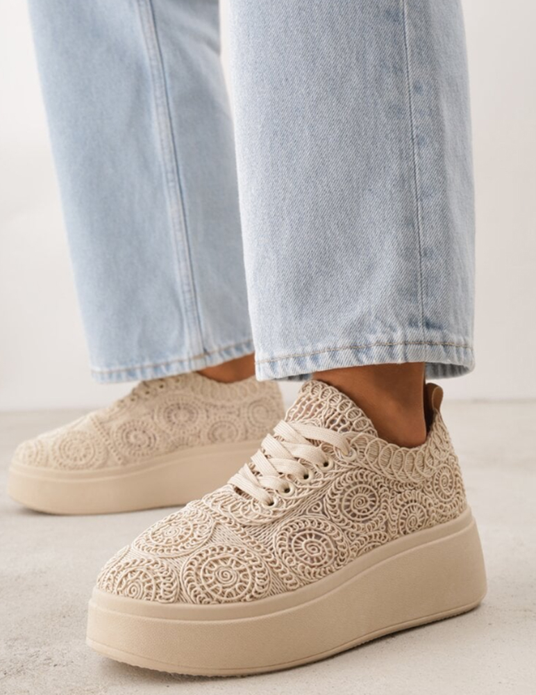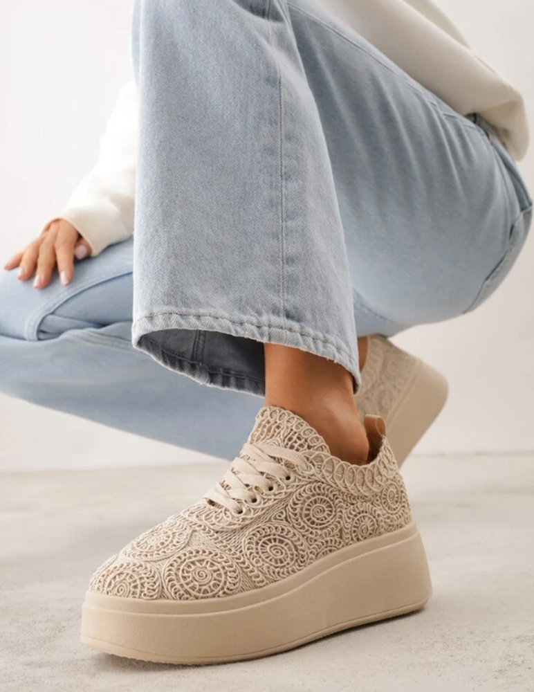 Dámske tenisky na platforme sú v elegantnom béžovom odtieni. Zaujmú originálnym dekoratívnym vzorom s plastickými ornamentmi, ktorý dodáva topánkam jedinečný a štýlový vzhľad. Majú klasické šnurovanie pre dobré prispôsobenie nohe a vyššiu, ľahkú platformovú podrážku, ktorá poskytuje pohodlie aj jemné optické zvýšenie postavy. Zvršok je mäkký a priedušný, vhodný na celodenné nosenie. Tenisky sú ideálne na bežné nosenie, do mesta aj na voľný čas, kde spájajú komfort s moderným dizajnom.