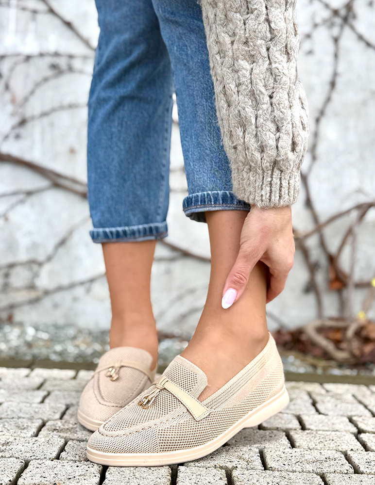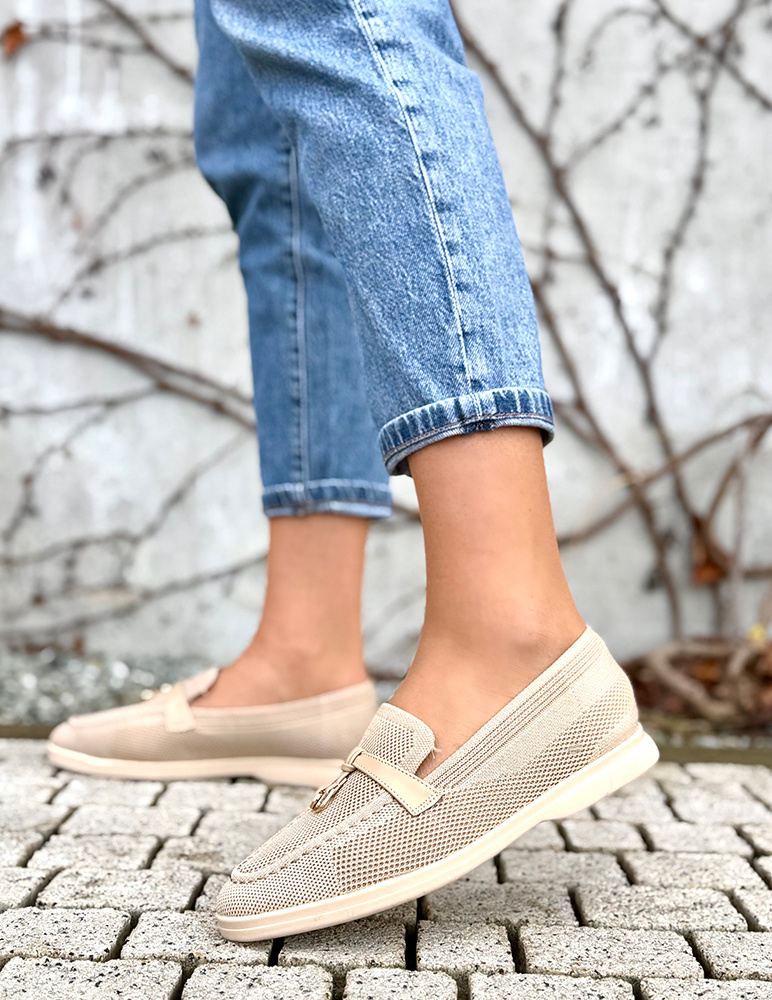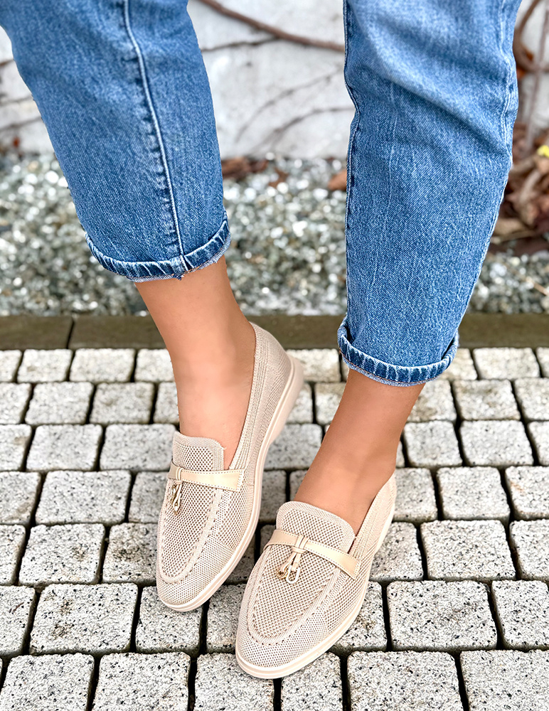 Dámske mokasíny v jemnom béžovom odtieni majú klasický slip-on strih so zaoblenou špičkou. Majú nízku, pohodlnú podrážku v béžovej farbe, ktorá zabezpečuje stabilitu pri chôdzi. Zvršok je vyrobený z priedušného textilného materiálu, vďaka čomu sú ideálne na teplejšie dni. Prednú časť zdobí dekoratívny pásik s kovovým detailom, ktorý dodáva topánkam elegantný a moderný vzhľad. Mokasíny sú vhodné na bežné nosenie, do práce aj na voľný čas, kde oceníte ich ľahkosť a pohodlie.