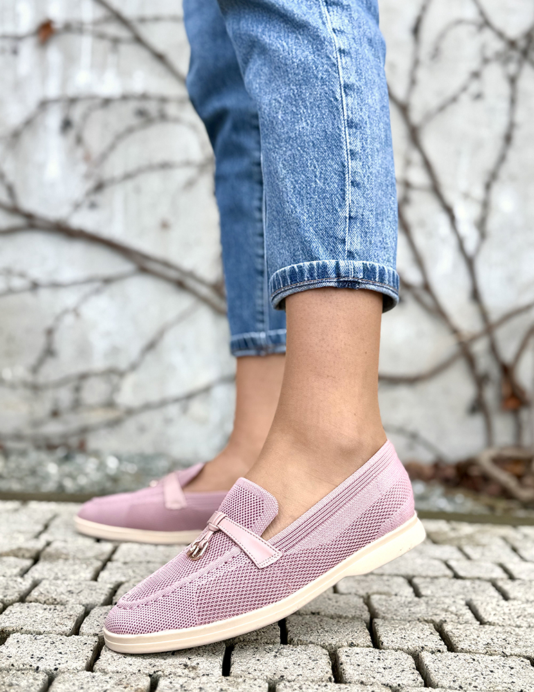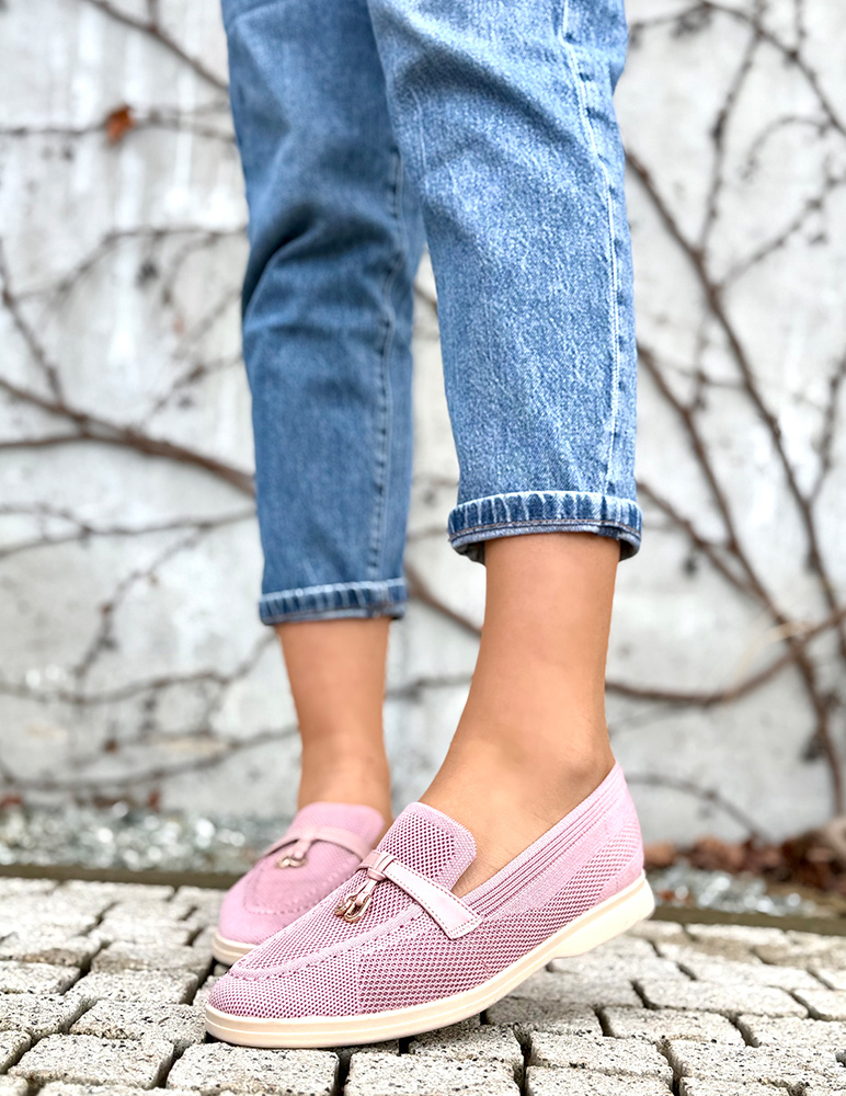 Dámske mokasíny v ružovom odtieni majú klasický slip-on strih so zaoblenou špičkou. Majú nízku, pohodlnú podrážku v béžovej farbe, ktorá zabezpečuje stabilitu pri chôdzi. Zvršok je vyrobený z priedušného textilného materiálu, vďaka čomu sú ideálne na teplejšie dni. Prednú časť zdobí dekoratívny pásik s kovovým detailom, ktorý dodáva topánkam elegantný a moderný vzhľad. Mokasíny sú vhodné na bežné nosenie, do práce aj na voľný čas, kde oceníte ich ľahkosť a pohodlie.