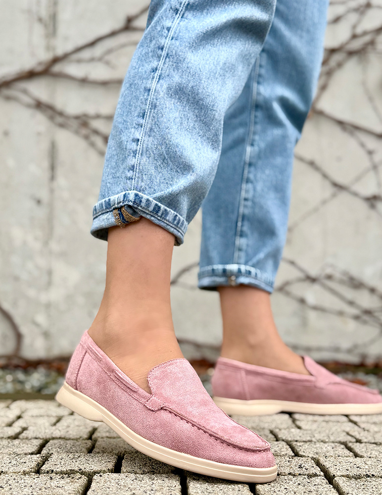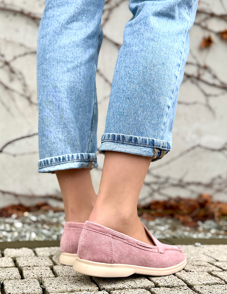 Tieto dámske mokasíny majú elegantný a nadčasový vzhľad. Sú vyrobené z jemného ekosemišu v ružovej farbe, ktorá pôsobí sofistikovane a ľahko sa kombinuje s outfitmi. Klasický mokasínový strih s prešívanou špičkou dodáva obuvi štýlový detail. Majú nízku, pevnú podrážku v béžovom odtieni, ktorá zabezpečuje pohodlie pri celodennom nosení. Mokasíny sú ideálne na bežné aj elegantnejšie príležitosti a skvele sa hodia k nohaviciam, sukniam aj šatám. Pohodlná a vkusná voľba na každý deň.
