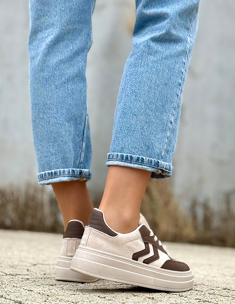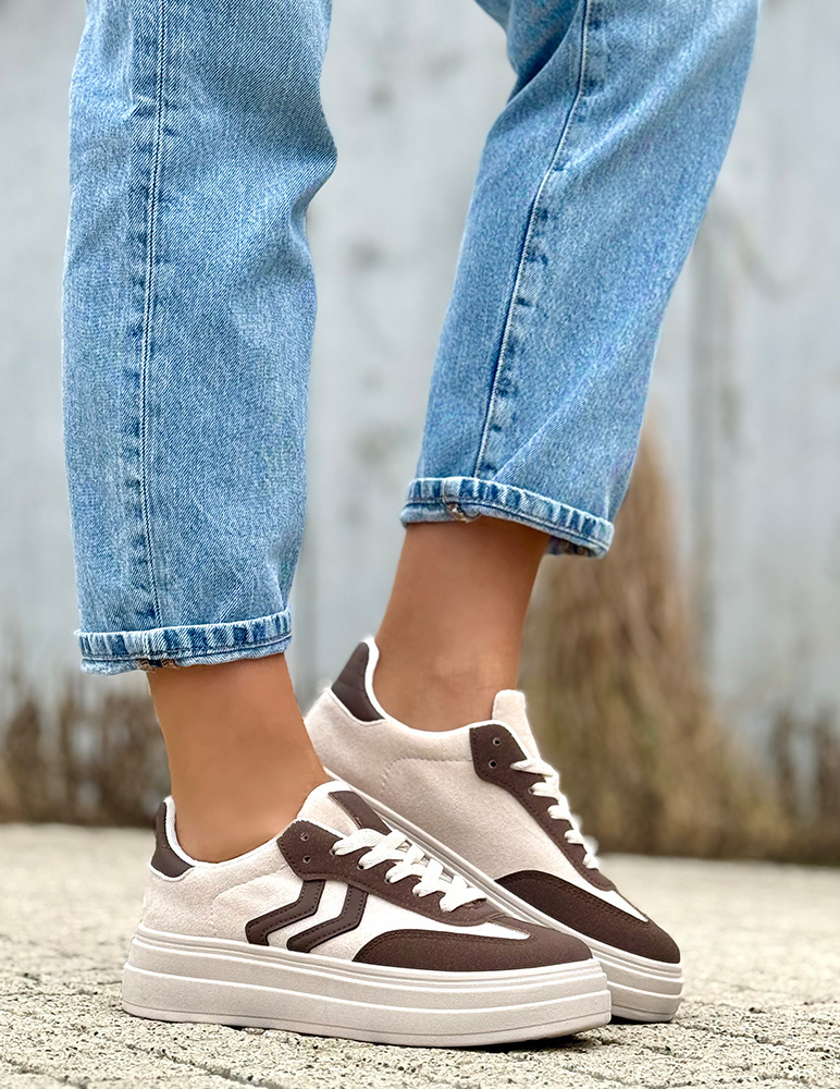 Tieto dámske tenisky majú moderný a štýlový dizajn vhodný na každodenné nosenie. Sú vyhotovené vo hnedom odtieni, ktorý pôsobí čisto a ľahko sa kombinuje s outfitmi. Kombinácia hladkého a ekosemišového materiálu dodáva teniskám zaujímavý vzhľad. Tenisky majú platformovú podrážku, ktorá poskytuje pohodlie, stabilitu a zároveň opticky predlžuje postavu. Klasické šnurovanie zabezpečuje dobré prispôsobenie nohe. Sú ideálne k džínsom, legínam aj šatám v športovo-mestskom štýle.