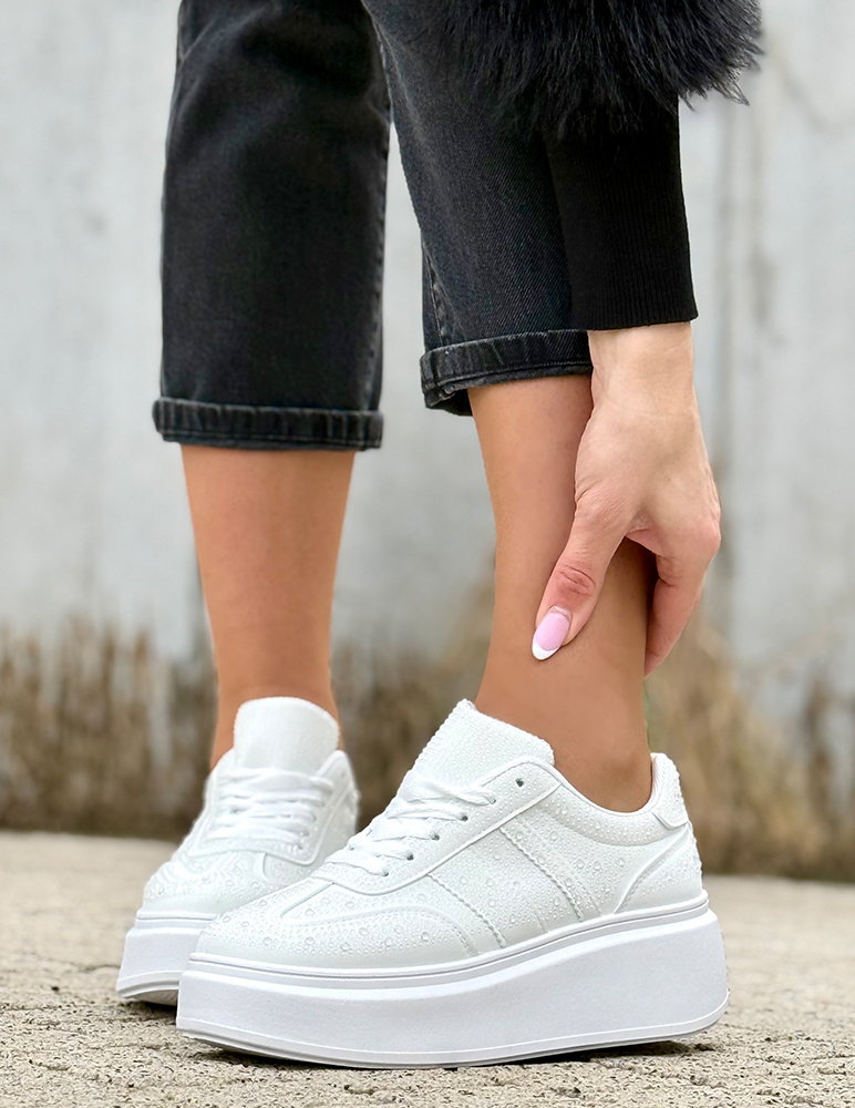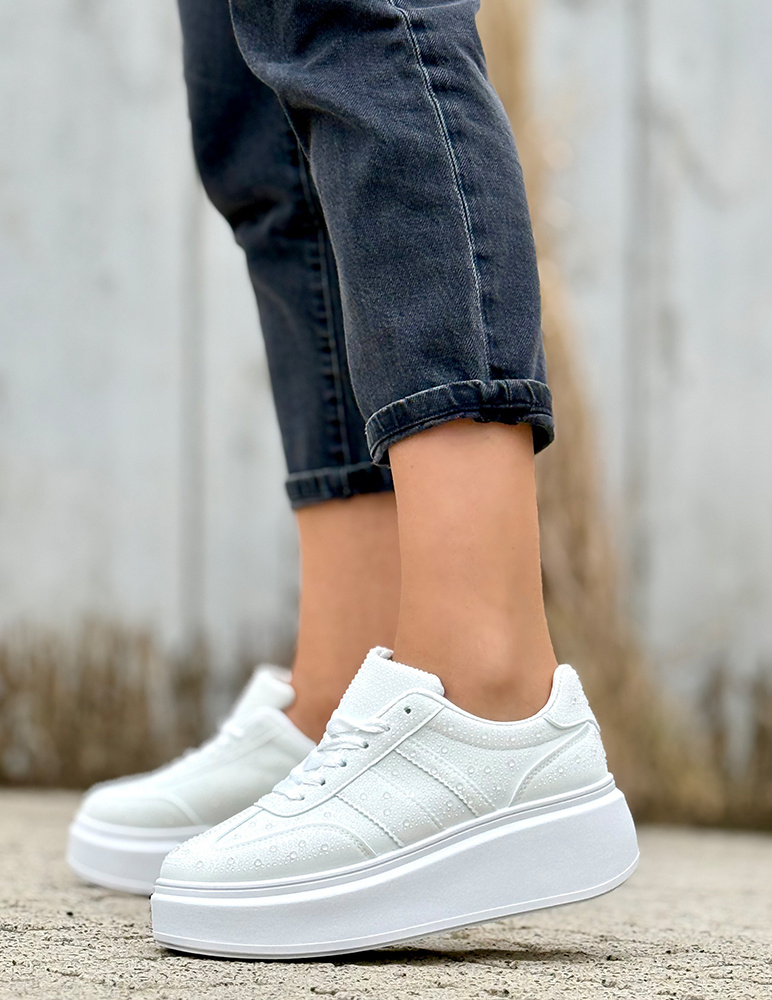 Tieto dámske tenisky majú jemný, ženský a moderný dizajn. Sú vyhotovené v bielej farbe s bielymi detailmi, ktoré pôsobia sviežo a štýlovo. Zaujímavým prvkom je dekoratívna textúra povrchu, ktorá dodáva teniskám originálny vzhľad. Tenisky sú osadené na výraznej platformovej podrážke, ktorá zabezpečuje pohodlie pri chôdzi a zároveň opticky predlžuje postavu. Klasické šnurovanie umožňuje dobré prispôsobenie nohe. Ideálne sa hodia na každodenné nosenie k džínsom, legínam aj športovo-ležérnym outfitom.