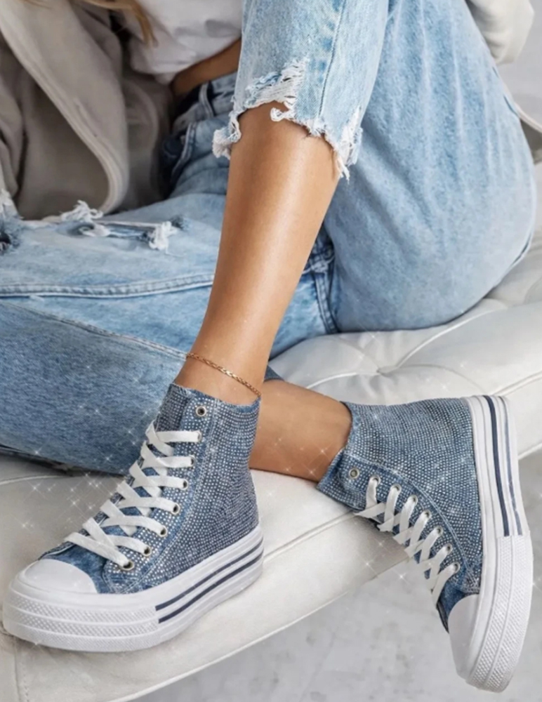 Tieto tenisky sú štýlové členkové topánky v modrej farbe. Majú klasický vysoký strih nad členok, ktorý poskytuje lepšiu oporu a zároveň pôsobí moderne a mladistvo. Zvršok je vyrobený z textilného materiálu s jemnou štruktúrou, ktorá dodáva teniskám zaujímavý vzhľad. Biele šnúrky a kovové očká vytvárajú pekný kontrast k modrému podkladu. Predná časť je spevnená typickou bielou gumovou špičkou. Tieto tenisky sú ideálne na bežné nosenie – hodia sa k džínsom, šortkám aj k ležérnym šatám.