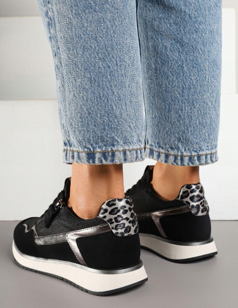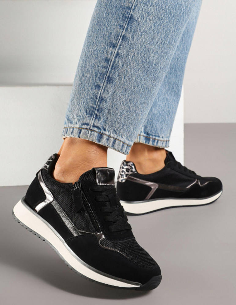 Tieto dámske tenisky v čierno-striebornej kombinácii majú športovo-elegantný dizajn vhodný na každodenné nosenie. Zvršok je vyrobený z kombinácie hladkého materiálu a priedušnej sieťoviny, ktorá zabezpečuje pohodlie a lepšiu cirkuláciu vzduchu. Tenisky sa zaväzujú na čierne šnúrky, no na vonkajšej strane sa nachádza aj výrazný strieborný zips, ktorý plní praktickú aj dekoratívnu funkciu. Podrážka je mierne zvýšená, v bielom odtieni, s jemným protišmykovým vzorom na spodnej časti.