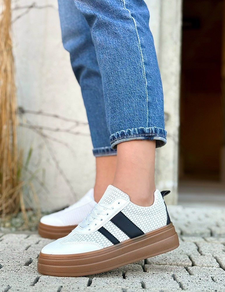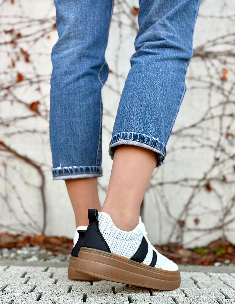 Tieto tenisky Dawn pôsobia moderne a štýlovo. Má jemnú farbu s kombináciou textilného sieťovaného materiálu a ekosemišových detailov, ktoré jej dodávajú zaujímavú textúru a vzdušný vzhľad. Na boku sa nachádzajú dva pruhy, ktoré vytvárajú športový kontrast. Obuv je vybavená hrubšou platformovou podrážkou v hnedej (gumovej) farbe, ktorá zabezpečuje pohodlie pri chôdzi a zároveň opticky predlžuje postavu.
