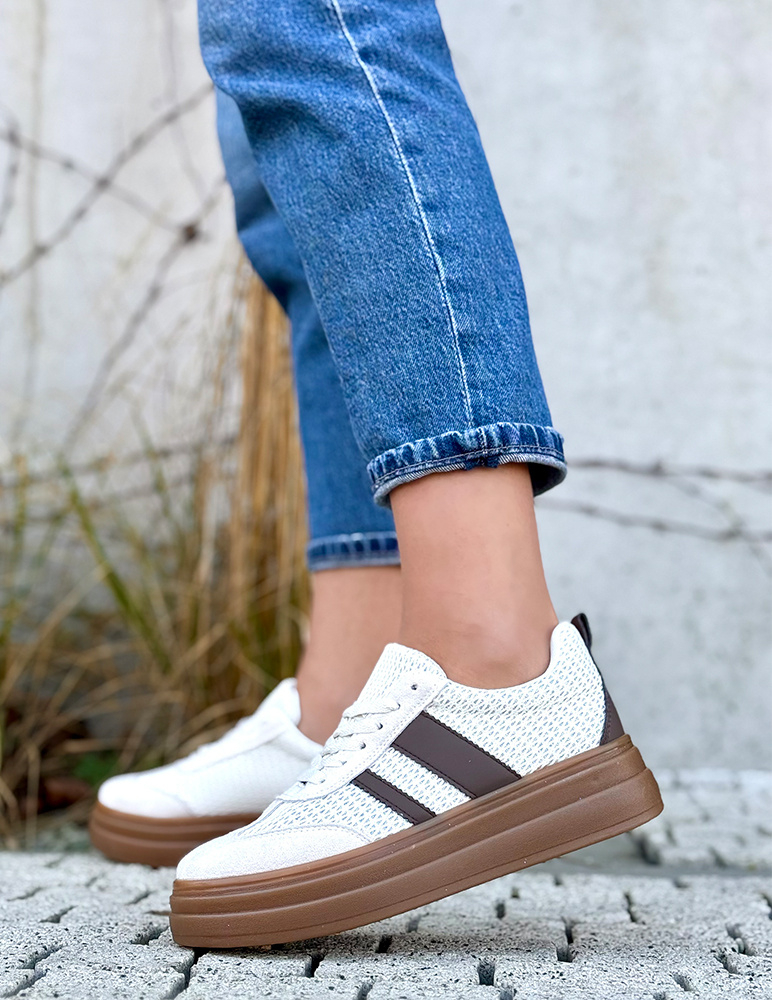 Tieto tenisky Dawn pôsobia moderne a štýlovo. Má jemnú farbu s kombináciou textilného sieťovaného materiálu a ekosemišových detailov, ktoré jej dodávajú zaujímavú textúru a vzdušný vzhľad. Na boku sa nachádzajú dva pruhy, ktoré vytvárajú športový kontrast. Obuv je vybavená hrubšou platformovou podrážkou v hnedej (gumovej) farbe, ktorá zabezpečuje pohodlie pri chôdzi a zároveň opticky predlžuje postavu.