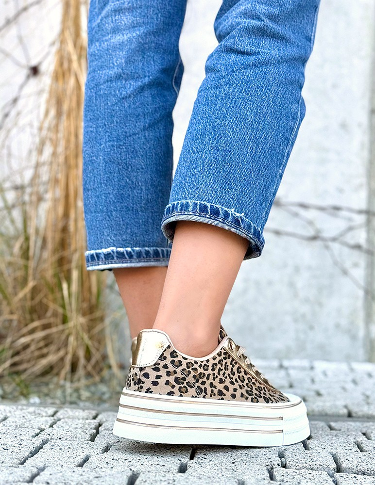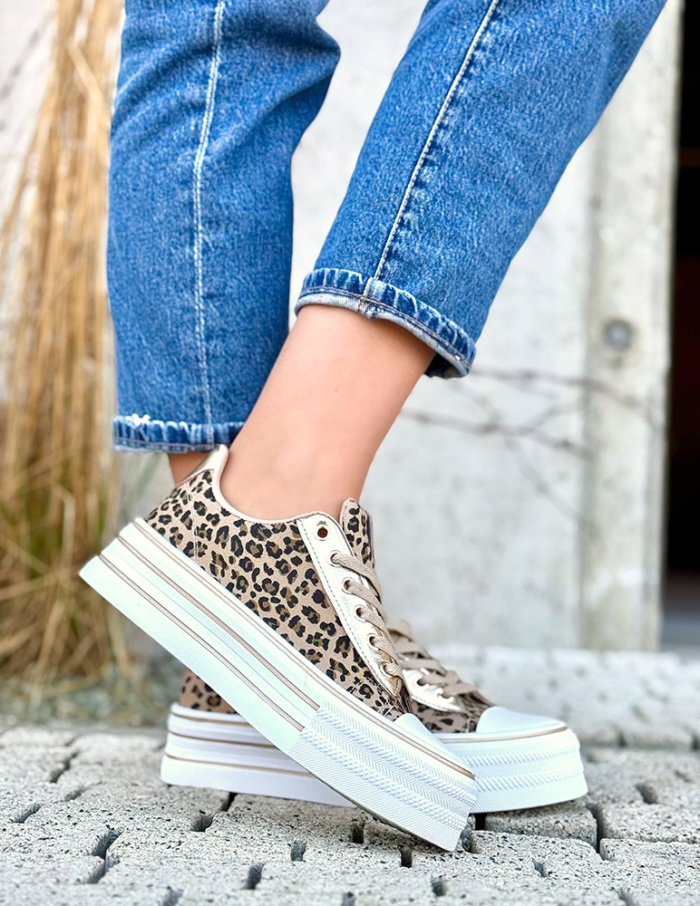 Leopardie textilné tenisky na platforme sú výrazným a módnym kúskom, ktorý okamžite upúta pozornosť. Zvršok je vyrobený z ľahkého textilného materiálu s leopardím vzorom, ktorý dodáva obuvi odvážny a trendy vzhľad. Vzor v prírodných tónoch hnedej, béžovej a čiernej sa ľahko kombinuje s jednoduchými outfitmi a dodáva im šmrnc. Tenisky sú doplnené klasickým šnurovaním, ktoré zabezpečuje dobré prispôsobenie nohe. Výrazná platformová podrážka nielenže opticky predlžuje postavu, ale zároveň poskytuje pohodlie a stabilitu pri chôdzi. Sú ideálne na voľno časové nosenie, do mesta či na stretnutia s priateľmi. Leopardie tenisky na platforme predstavujú dokonalé spojenie pohodlia, originality a moderného štýlu.