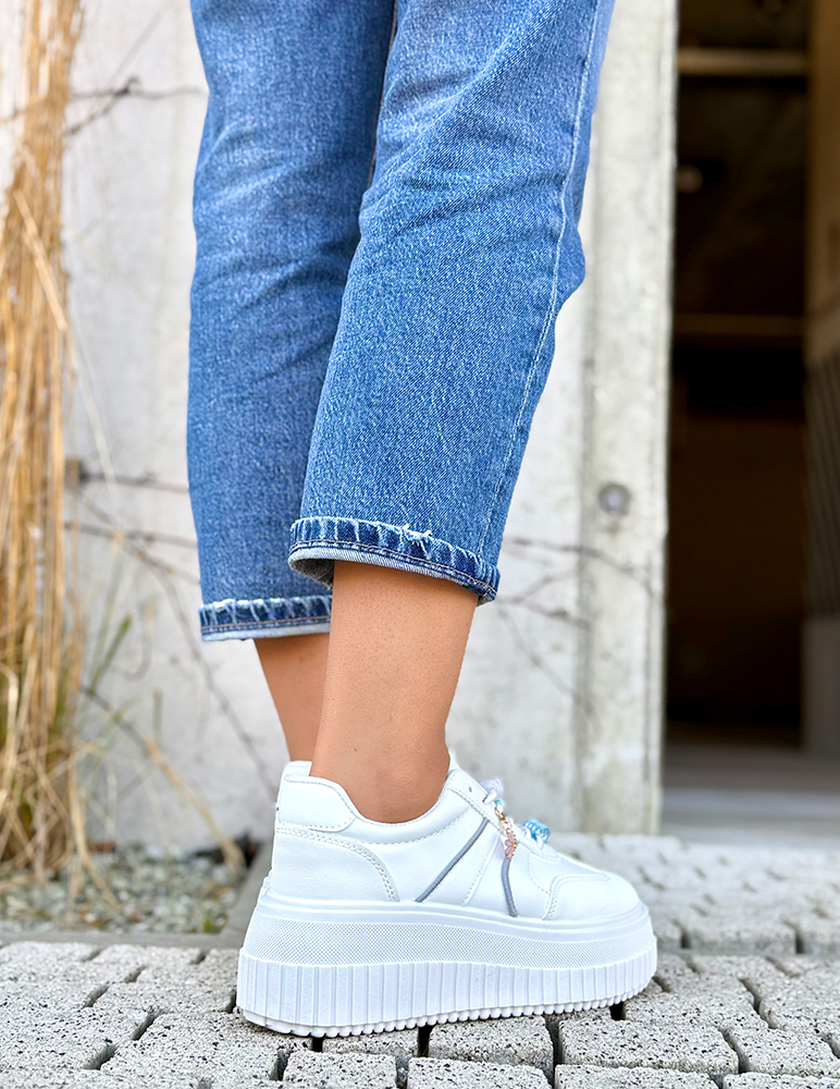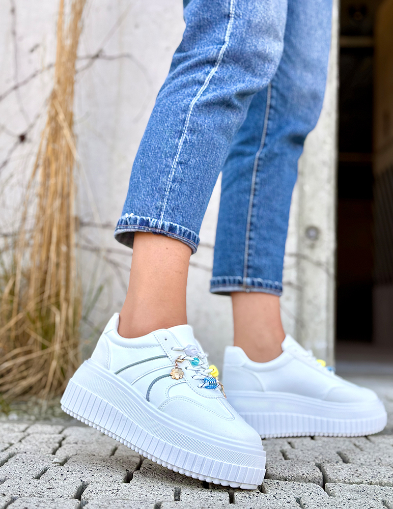 Dámske biele tenisky Maisie na platforme s moderným a hravým dizajnom. Tenisky majú hladký zvršok, ktorý pôsobí čisto a minimalisticky. Po bokoch sú jemné dekoratívne prešívané línie, ktoré dodávajú topánke športovo-elegantný vzhľad. Zaväzujú sa na biele šnúrky, na ktorých sú pripevnené malé ozdobné prívesky – napríklad farebné korálky, kvietok a drobné dekorácie, ktoré teniske dodávajú veselý a originálny štýl. Podrážka je hrubá platformová, s výrazným ryhovaným vzorom po obvode.