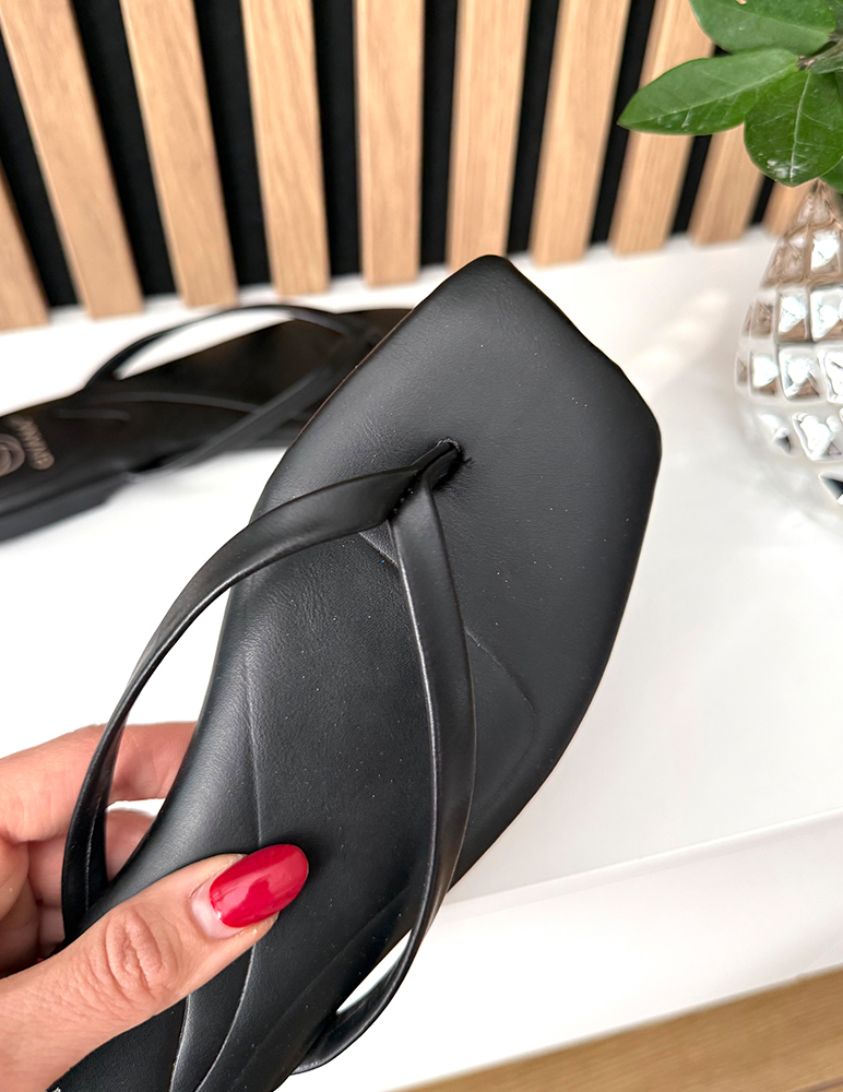 Dámske čierne šľapky Saylor sú vyrobené z kvalitnej ekokože, ktorá pôsobí elegantne a zároveň sa ľahko udržiava. Dizajn je jednoduchý a nadčasový, s typickým remienkom medzi prstami. Pásiky sú jemné, no pevné, takže dobre držia na nohe. Šľapky majú malý opätok, ktorý mierne zdvíha pätu a dodáva obuvi ženský a elegantný vzhľad, pričom si zachováva komfort pri chôdzi. Šľapky majú extra mäkkú stielku.