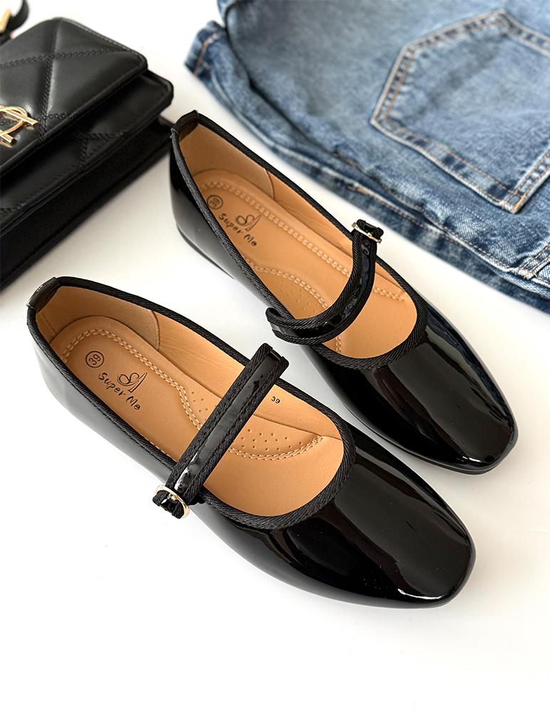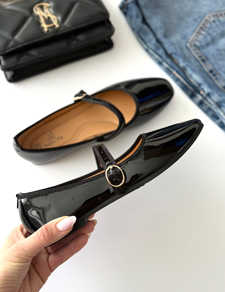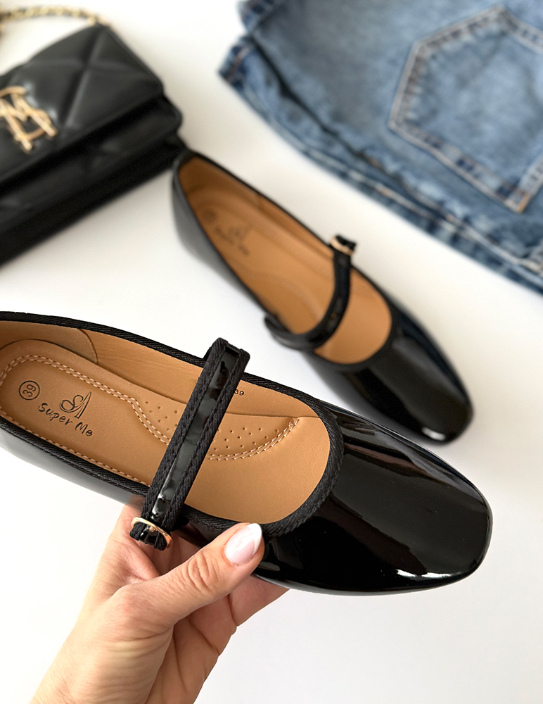 Elegantné čierne balerínky Maryam, ktoré pôsobia veľmi štýlovo a nadčasovo. Majú zaoblenú špičku a nízky podpätok, ktorý zabezpečuje pohodlie pri chôdzi. Dominantným prvkom je remienok cez priehlavok so zlatou okrúhlou prackou, ktorý nielen esteticky dopĺňa dizajn, ale zároveň zlepšuje fixáciu nohy v topánke. Vnútorná stielka je määká, pohodlná na nosenie.