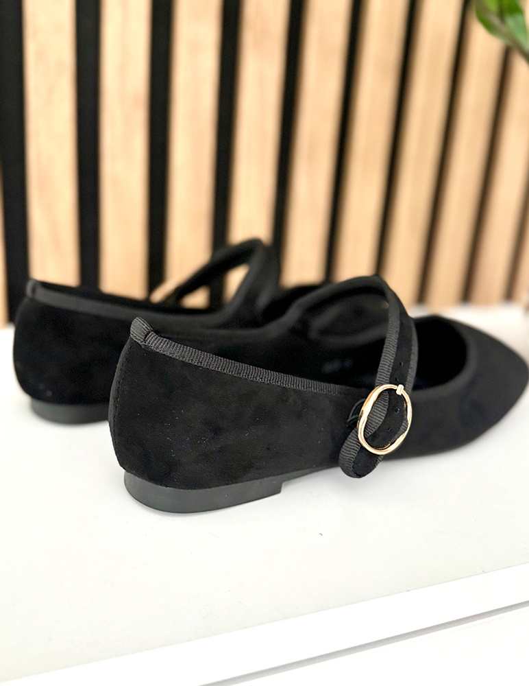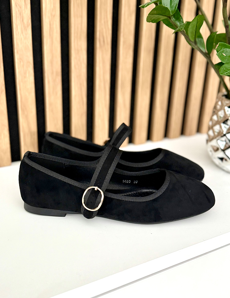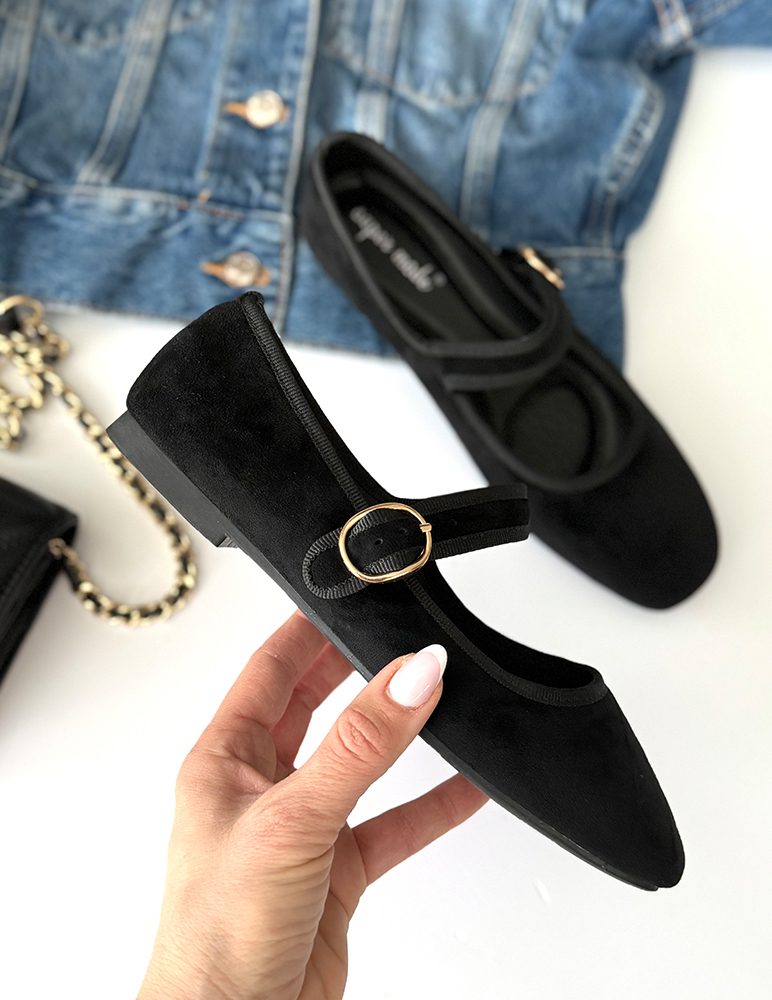 Elegantné dámske balerínky Dua. Majú zaoblenú špičku a nízky podpätok v tmavšom odtieni, ktorý zabezpečuje pohodlie pri chôdzi. Dominantným prvkom je remienok cez priehlavok so zlatou okrúhlou prackou, ktorý nielen esteticky dopĺňa dizajn, ale zároveň zlepšuje fixáciu nohy v topánke. Okraje baleríniek sú jemne lemované, čo pridáva na detailnosti spracovania. Vnútorná stielka je mäkká, pohodlná na nosenie.