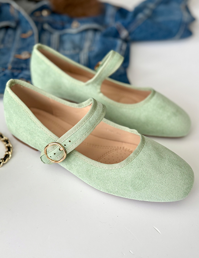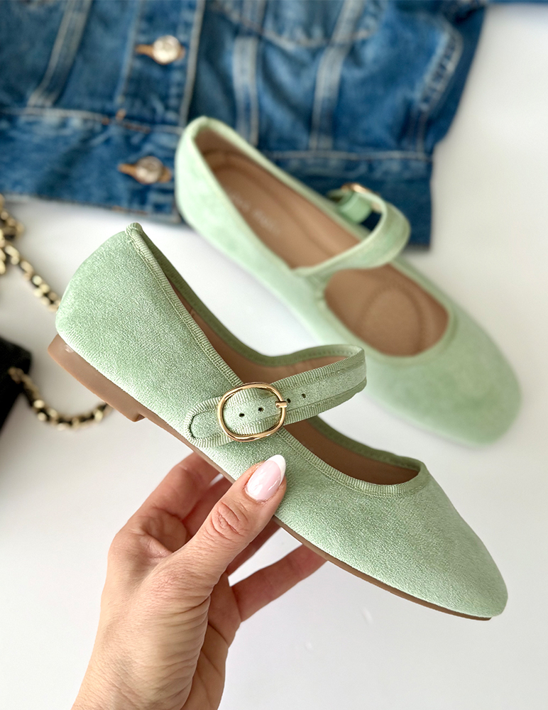 Elegantné dámske balerínky Dua. Majú zaoblenú špičku a nízky podpätok v tmavšom odtieni, ktorý zabezpečuje pohodlie pri chôdzi. Dominantným prvkom je remienok cez priehlavok so zlatou okrúhlou prackou, ktorý nielen esteticky dopĺňa dizajn, ale zároveň zlepšuje fixáciu nohy v topánke. Okraje baleríniek sú jemne lemované, čo pridáva na detailnosti spracovania. Vnútorná stielka je mäkká, pohodlná na nosenie.