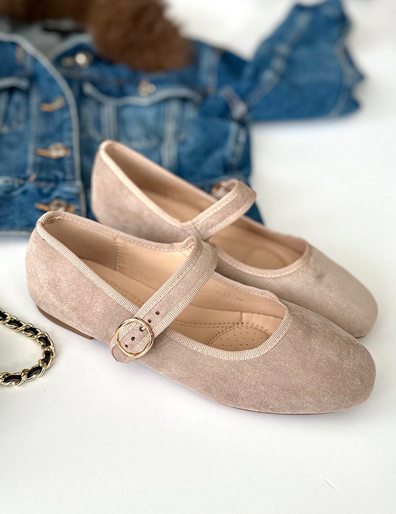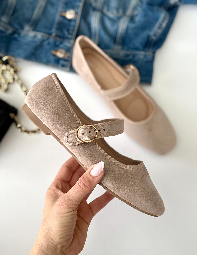 Elegantné dámske balerínky Dua. Majú zaoblenú špičku a nízky podpätok v tmavšom odtieni, ktorý zabezpečuje pohodlie pri chôdzi. Dominantným prvkom je remienok cez priehlavok so zlatou okrúhlou prackou, ktorý nielen esteticky dopĺňa dizajn, ale zároveň zlepšuje fixáciu nohy v topánke. Okraje baleríniek sú jemne lemované, čo pridáva na detailnosti spracovania. Vnútorná stielka je mäkká, pohodlná na nosenie.