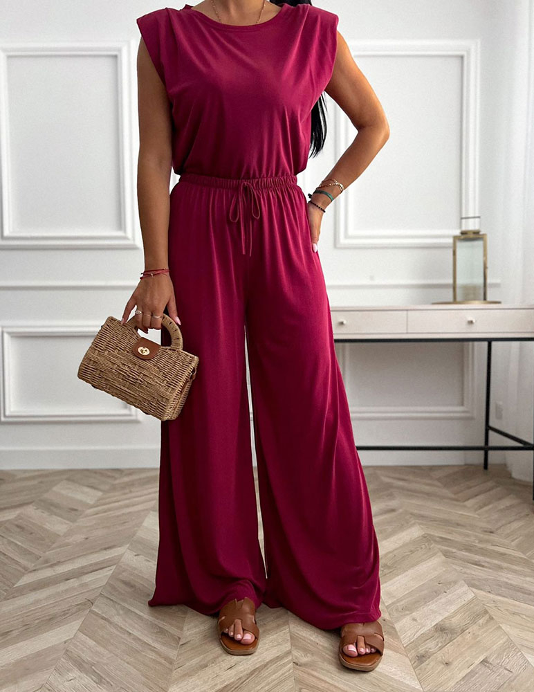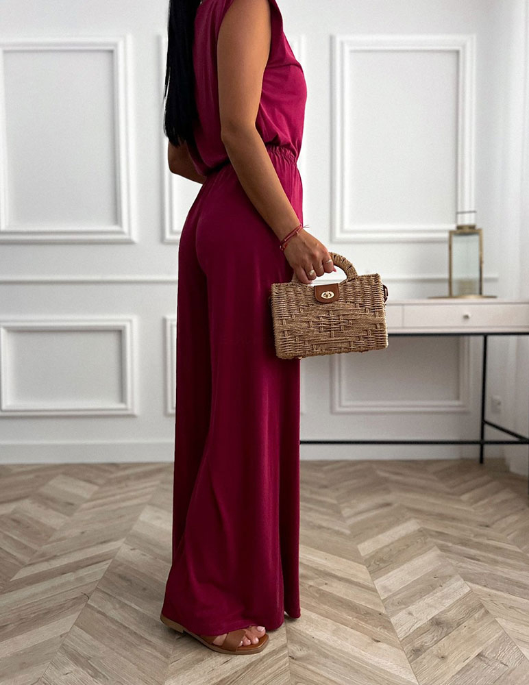 Štýlový dámsky bordový komplet Primrose, ktorý pôsobí elegantne a zároveň veľmi pohodlne. Skladá sa z voľného vrchného dielu bez rukávov s vypchávkami, čo dodáva siluete moderný a mierne štruktúrovaný vzhľad. Spodnú časť tvoria dlhé nohavice so širokými nohavicami, ktoré pôsobia vzdušne a elegantne pri pohybe. V páse sú nohavice elastické, natiahnu sa až do veľkosti XL.