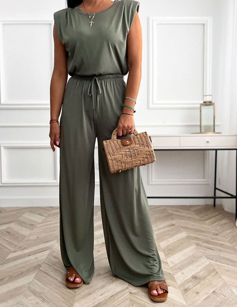Štýlový dámsky zelený komplet Primrose, ktorý pôsobí elegantne a zároveň veľmi pohodlne. Skladá sa z voľného vrchného dielu bez rukávov s vypchávkami, čo dodáva siluete moderný a mierne štruktúrovaný vzhľad. Spodnú časť tvoria dlhé nohavice so širokými nohavicami, ktoré pôsobia vzdušne a elegantne pri pohybe. V páse sú nohavice elastické, natiahnu sa až do veľkosti XL.