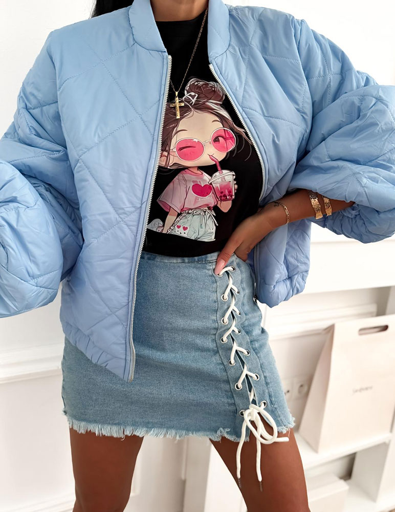 Moderná dámska bunda v modrej farbe, ktorá pôsobí sviežo a štýlovo. Má prešívaný dizajn s jemným geometrickým vzorom, ktorý jej dodáva zaujímavú textúru. Strih bundy je mierne voľný. Zapínanie je riešené pomocou zipsu po celej dĺžke, pričom golier je jednoduchý a bez kapucne. Rukávy sú mierne objemnejšie a zakončené elastickým lemom. Vhodná na prechodné obdobie.