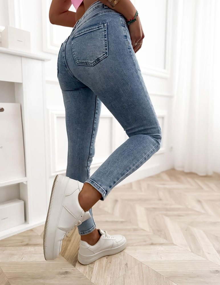 Jednoduché skinny džínsy Honoria pôsobia moderne, nadčasovo a veľmi univerzálne. Sú vyrobené z denimového materiálu, ktorý je doplnený o elastan, vďaka čomu sa prispôsobia postave a pohodlne obopnú nohy. Strih je priliehavý po celej dĺžke od pásu cez boky až po členky, čím zvýrazňuje siluetu a opticky predlžuje nohy. Džínsy majú klasický dizajn bez výrazných ozdôb, čo im dodáva čistý a minimalistický vzhľad.