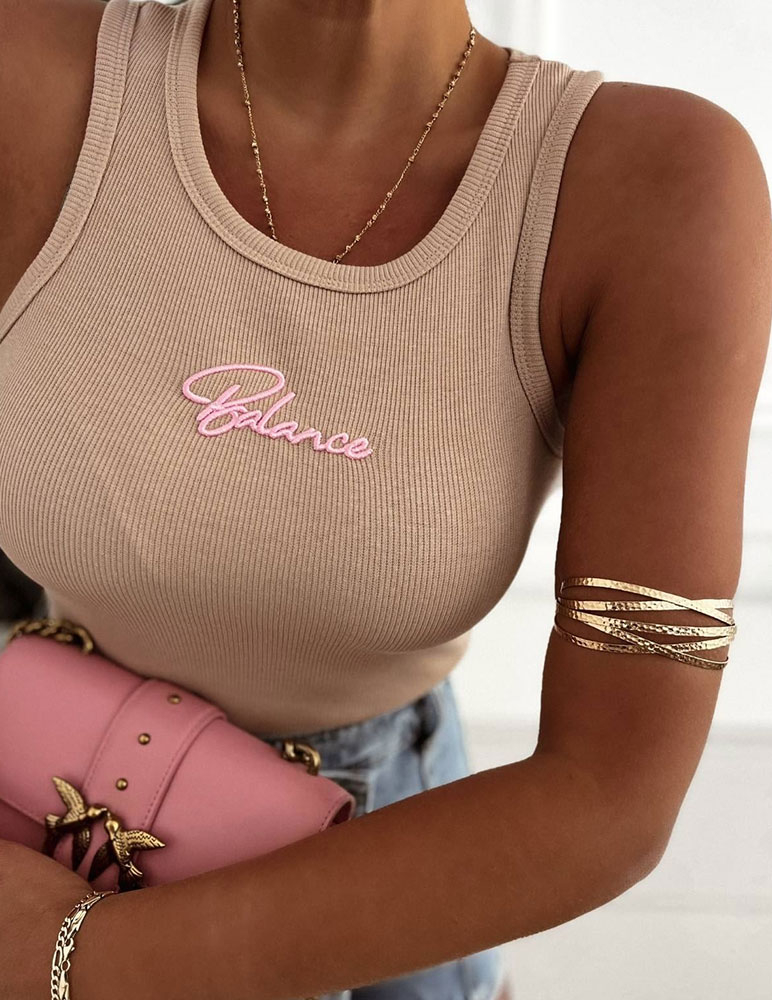 Béžové tielko Indie pôsobí moderne a žensky. Má priliehavý strih, ktorý kopíruje postavu, a je vyrobené z rebrovaného materiálu, čo mu dodáva jemnú textúru a zároveň zvýrazňuje jeho športovo-ležérny charakter. Širšie ramienka a okrúhly výstrih vytvárajú pohodlný a univerzálny dizajn vhodný na každodenné nosenie. Dominantným prvkom je nápis „Balance“ umiestnený v strede hrudníka, ktorý dodáva tielku minimalistický, no zároveň štýlový akcent.