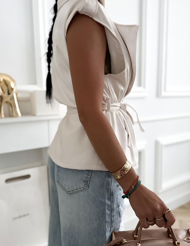 Táto biela koženková vesta Lyra pôsobí elegantne a moderne. Má výrazný golier s prekladaným dizajnom, ktorý dodáva celému modelu nádych luxusu a mierne formálneho štýlu. Vesta je bez rukávov, no v oblasti ramien má mierne zvýraznený strih a výložky s gombíkom. V páse je doplnená opaskom z rovnakého materiálu, ktorý sa viaže na uzol a krásne zvýrazňuje siluetu.