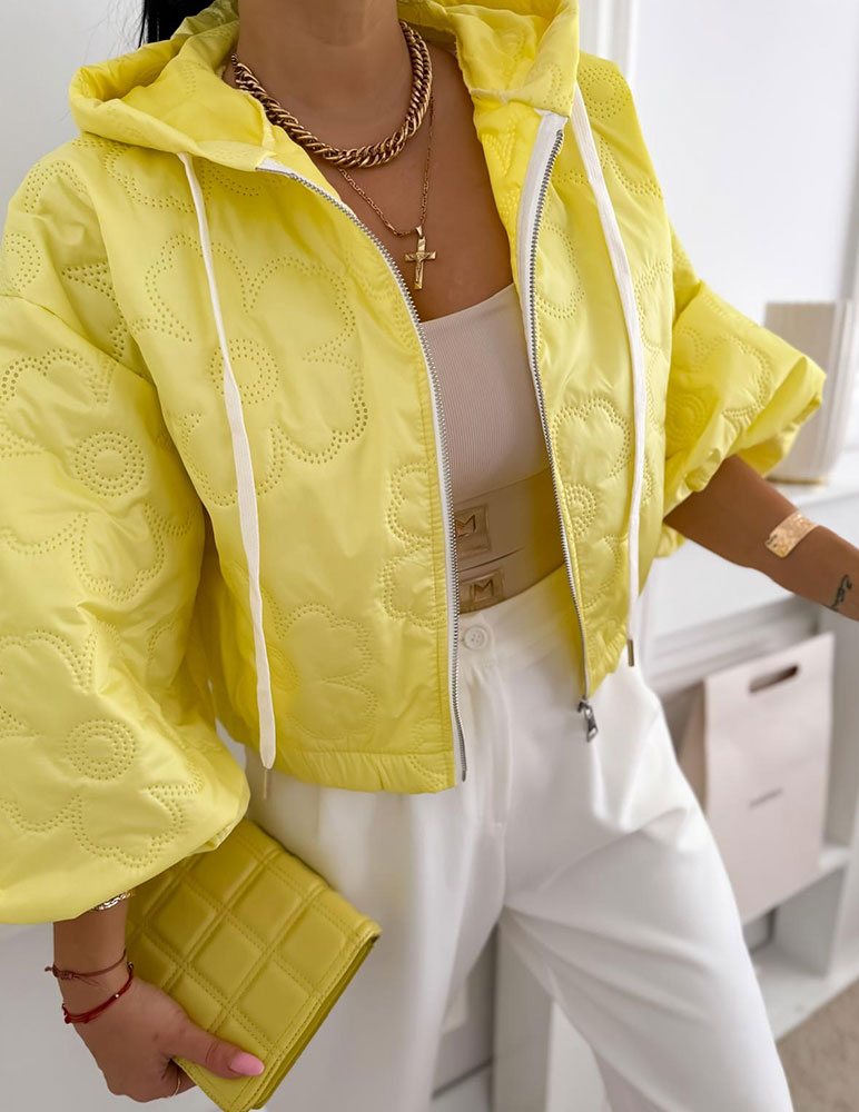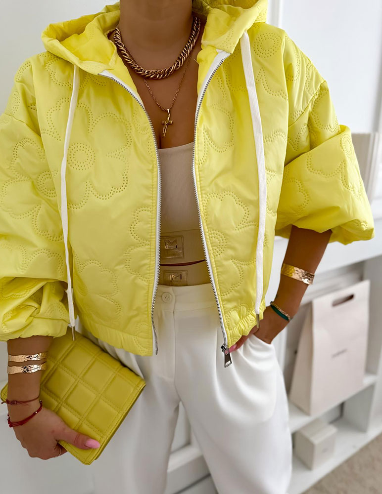 Táto bunda Sloane pôsobí veľmi jemne, žensky a elegantne vďaka svojmu sviežemu odtieňu a prepracovanému detailu materiálu. Je ušitá z ľahkej látky s plastickým prešívaným vzorom v tvare kvetov, ktorý dodáva celkovému vzhľadu romantický a zároveň moderný charakter. Strih je mierne voľný, s dlhými rukávmi zakončenými jemným nariasením. Model má kapucňu so šnúrkami a zapínanie na zips.